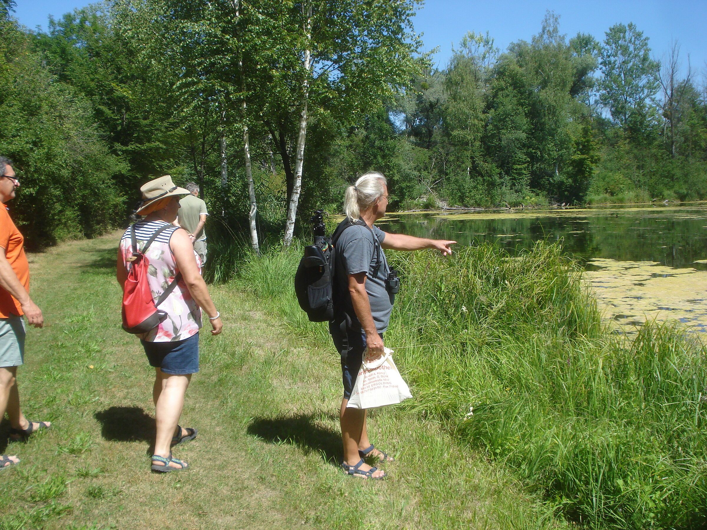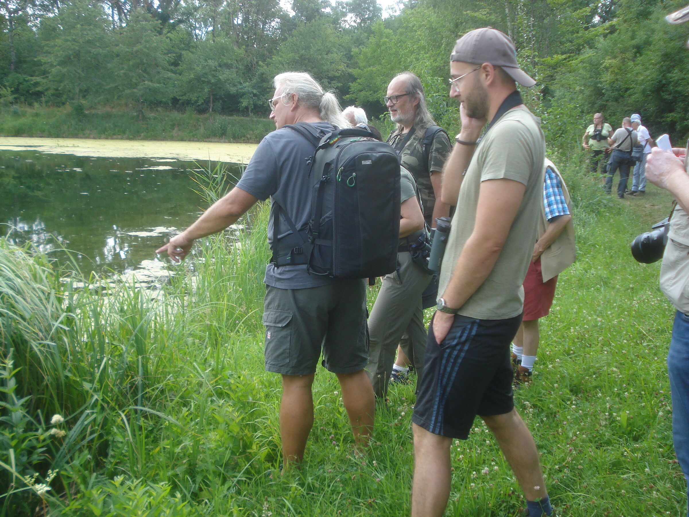 Am benachbarten Weiher konnte Leinsinger zehn verschiedene Libellenarten zeigen. Unter anderem saßen oder flogen an dem Gewässer die Braune Mosaikjungfer, die Große Königslibelle und der Große Blaupfeil. Sehr beeindruckend waren die verschiedenen Farben und Musterungen der Tiere. Die Feuerlibelle mit ihrer knallroten Färbung sei unverkennbar, so der Libellenkundler. Sie komme aus dem südlichen Europa und profitiere vom Klimawandel. Andere Libellen seien jedoch vom Klimawandel bedroht, beispielsweise die Speer Azurjungfer ist im Süden rückläufig. Zu sehen waren auch die Große Pechlibelle, die Gemeine Becherjungfer, und das Kleine Granatauge. Diese Art, erkenne man an den roten, verhältnismäßig großen Augen.