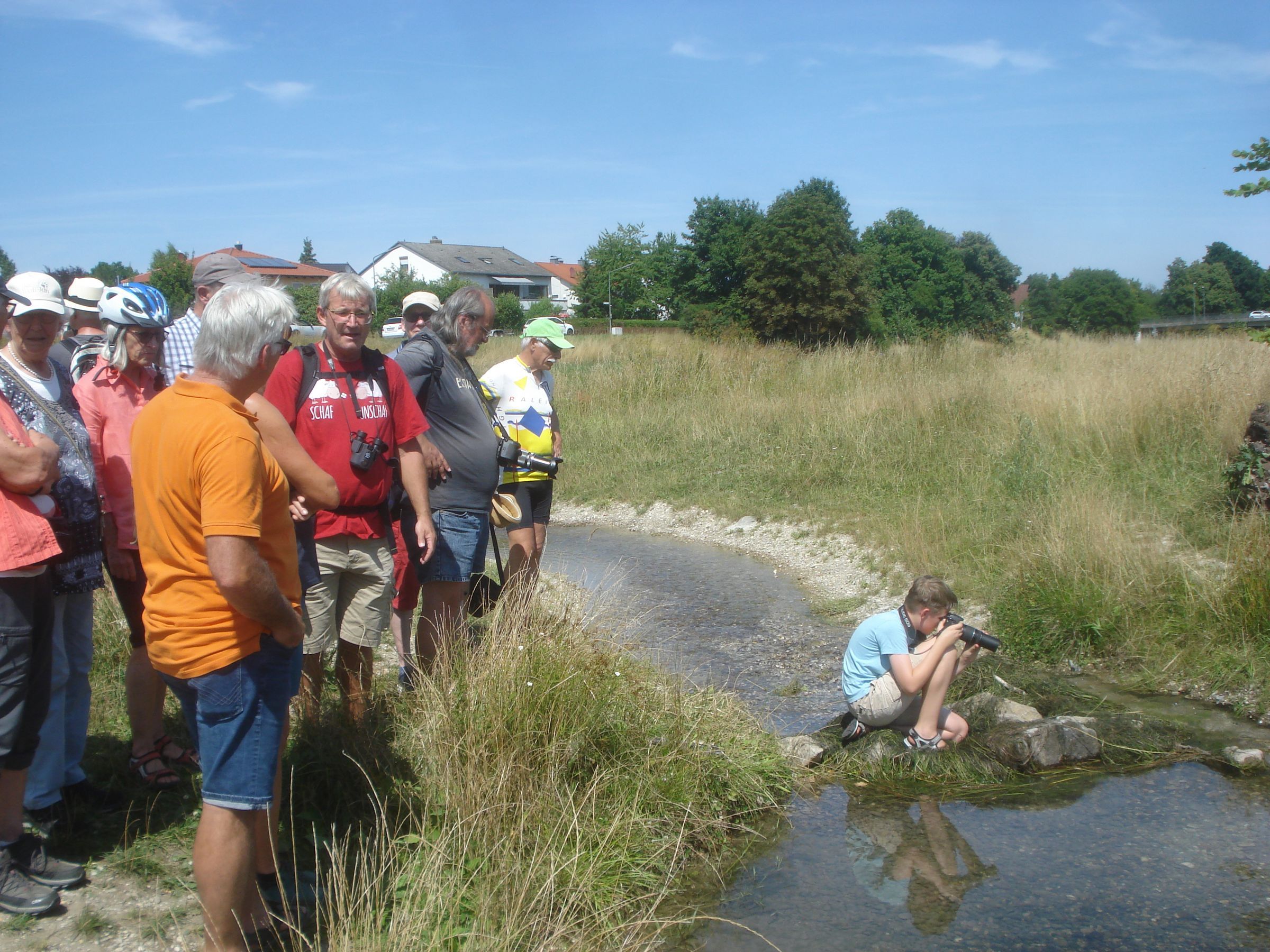 Die naturkundliche Exkursion startete am Längenmühlbach. Hier konnten sogleich Libellen beider Unterordnungen gesichtet werden. So war von den Kleinlibellen die Gebänderte Prachtlibelle in größerer Anzahl in den Farben blau und blaßgrün am Bach. Herr Leinsinger konnte berichten, dass es sich bei dem grünen Exemplar um das Weibchen und bei den mehreren blauen Individuen um Männchen handelt, die dem Weibchen hinterherfliegen. Eine Kleine Königslibelle aus der Unterordnung der Großlibellen wurde beim Überfliegen der Brücke beobachtet. Diese Art hat große Reviere und wurde auf der Exkursion an den verschiedenen Fließ- und Stillgewässern entdeckt.