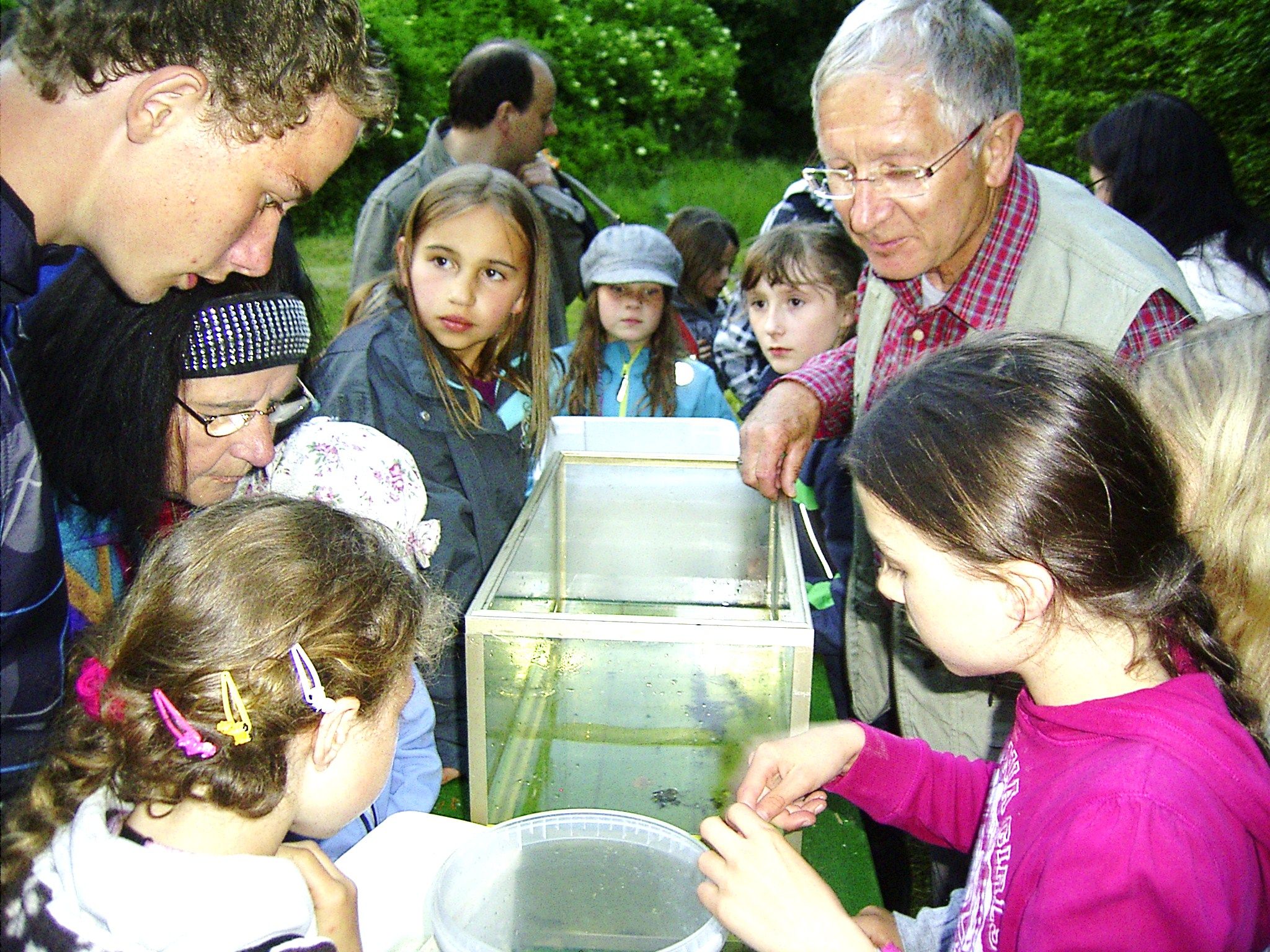 Herbert Parusel hatte am Rande eines Amphibiengewässers auch ein Aquarium aufgestellt, um insbesondere den interessierten Kindern die Wassertiere aus nächster Nähe zu zeigen und sie mit ihnen in Kontakt kommen zu lassen. Mit großer Begeisterung griffen die kleinen Froschfreunde dann auch ins Wasser, um den Teich- und Bergmolch in die Hand zu nehmen. Aber auch Kaulquappen und einen großen Seefrosch sowie weitere Wasserlebewesen, wie Rückenschwimmer, Gelbrandkäfer, Blutegel und Larven von Libellen, tummelten sich im Wasserbecken.