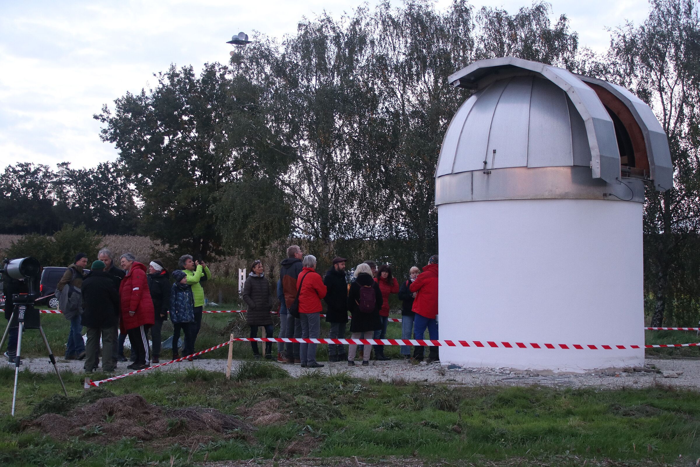 Ein Anruf bei den „Wetterfröschen“ des Münchner Flughafens brachte das okay. Am Treffpunkt vor dem Altdorfer Rathaus wurden Fahrgemeinschaften gebildet und zum vereinseigenen Gelände der Hobby-Astronomen nach Stollnried gefahren. Das Vorstandsmitglied der Sternenfreunde, Oliver Neumann, begrüßte die Teilnehmer und informierte die Gruppe über den im Mai fertiggestellten „Agerer“turm, der ein Teleskop von 36 cm Spiegeldurchmesser beinhaltet. Dieser konnte durch die großzügige Schenkung der Kuppel und des Teleskops des sehr versierten Astronomen und Vereinsmitglied Fritz Agerer erbaut werden. Leider ist dieser vor kurzem verstorben.