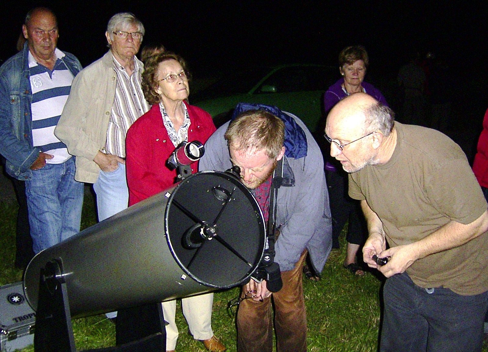 Eine Rekordzahl von etwa 50 Beobachtern waren ab 20 Uhr gekommen, um die gerade untergehende Venus, den Jupiter und vor allem den Saturn mit seinem riesigen Ring im Fernrohr zu sehen. Dazu hatte Felix Bachmaier sein "Dobson" mit 30cm Spiegeldurchmesser und Bernhard Schwing seine "Russentonne" auf einem Wiesendreieck aufgebaut. Diszipliniert warteten die 8 bis 80jährigen Sternfreunde, bis sie einen Blick durch die Teleskope werfen konnten. Die beiden Experten erklärten jeweils die Besonderheiten der gezeigten Objekte und beantworteten die Fragen der Besucher.
