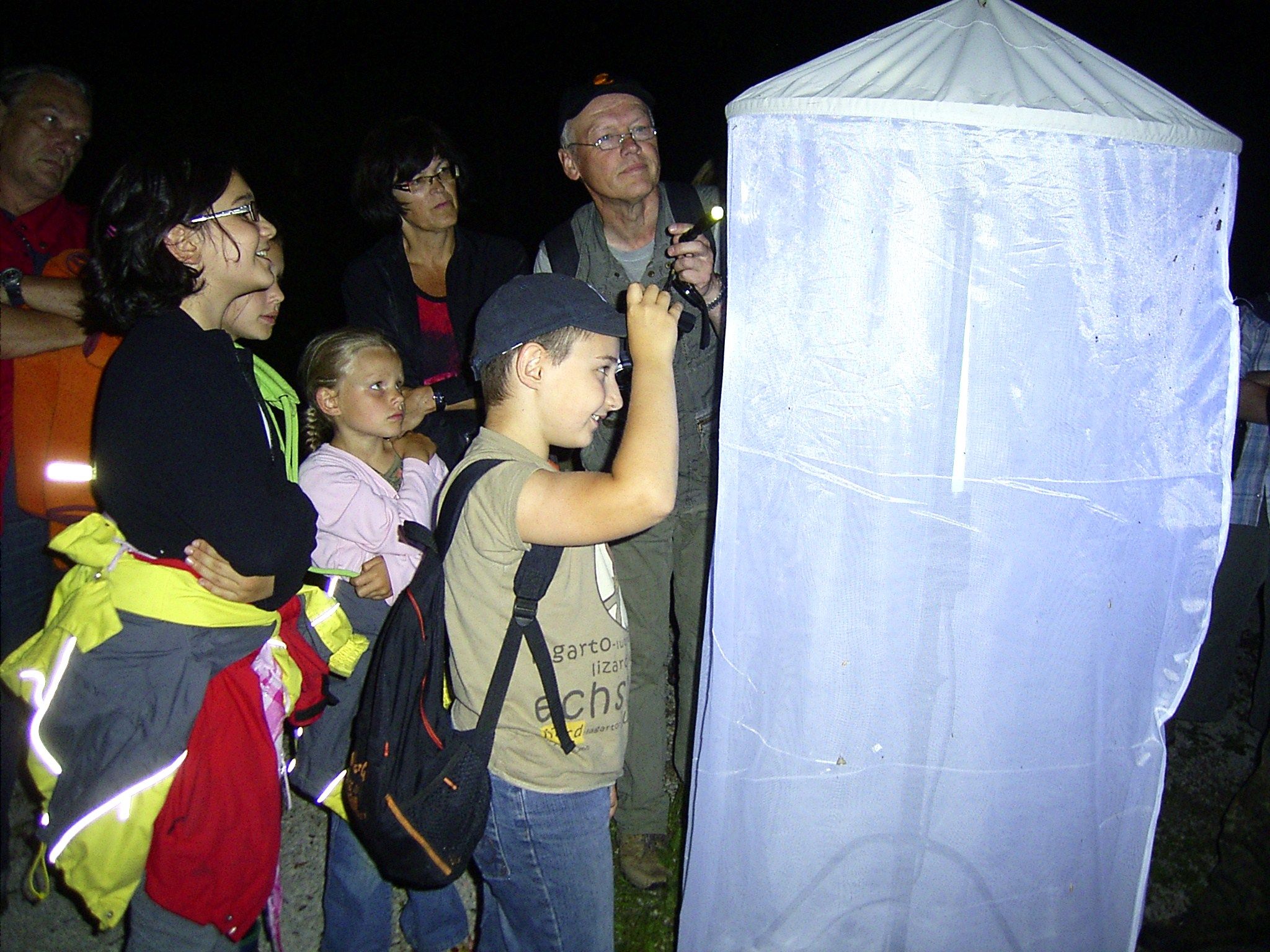 Die Nacht war sehr warm, windstill und der Himmel bewölkt – und damit ideal zum Anlocken von Nachtfaltern, nicht aber zum Mond- und Sternegucken. Man hoffte jedoch, dass sich später die Wolken auflösen werden und Mond und Sterne zu sehen sein werden. So wanderten die Besucher zuerst in einen nahegelegenen Laubwald, wo Helmut Kolbeck und sein Kollege Wolfgang Willner bereits sogenannte „Leuchttürme“ errichtet hatten, deren Leuchtquelle mit hohem UV-Anteil Nachtfalter verschiedenster Arten anzog. Während den Ausführungen von Helmut Kolbeck zur Biologie und zum Vorkommen von Nachtfaltern konnten aus nächster Nähe Schwärmer, Spinner, Glucken, Eulenfalter, Zünsler, Wickler und Motten, so beispielsweise Kiefernschwärmer, Bärenspinner, Silbereulchen, Grünes Blatt, Perlspanner und Graszünsler, betrachtet werden. Über 60 verschiedene Arten, darunter auch Fliegen, Wanzen und Käfer, stellte Kolbeck fest.