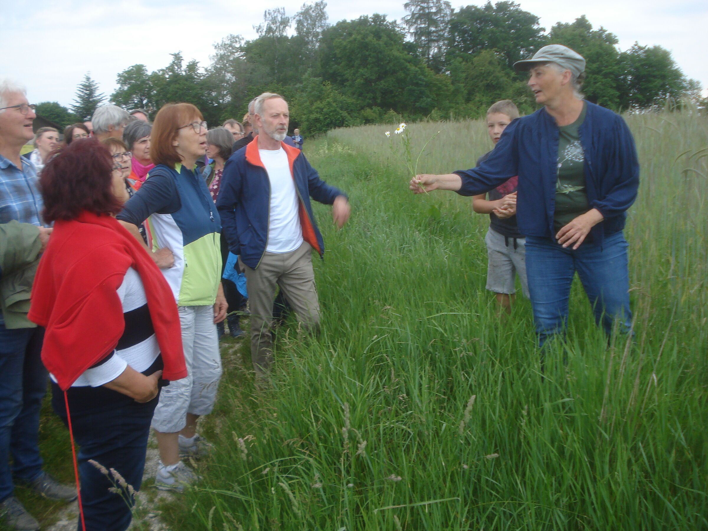 Lisa Fleischmann, eine fundierte Pflanzenkennerin, stellte den zahlreich gekommenen Besuchern den Betrieb vor. Bewirtschaftet würden derzeit etwa 40 Hektar. Auf ökologische Landwirtschaft umgestellt wurde 1987. Anfangs wurde normaler Ackerbau betrieben. Mit der Zeit, so Lisa Fleischmann, habe man aber den Schwerpunkt immer mehr auf eine größere Biodiversität gelegt. So wurde in Hof nähe eine Streuobstwiese angelegt, welche derzeit von zehn Mutterschafen und etwa zwanzig Lämmern beweidet würde. Das Obst werde komplett genutzt.
