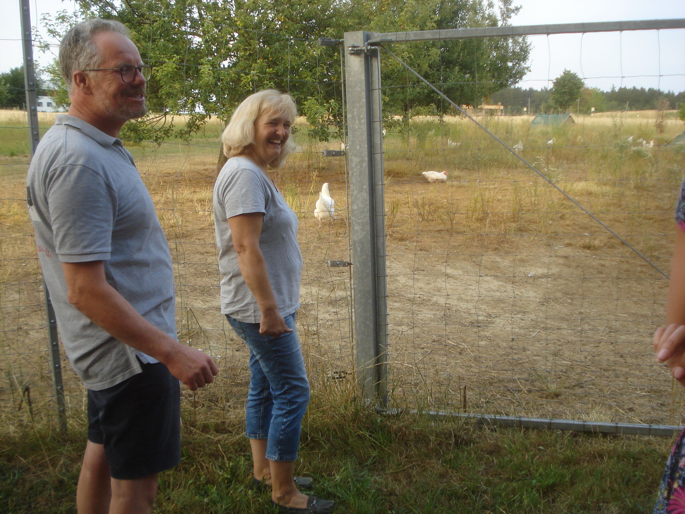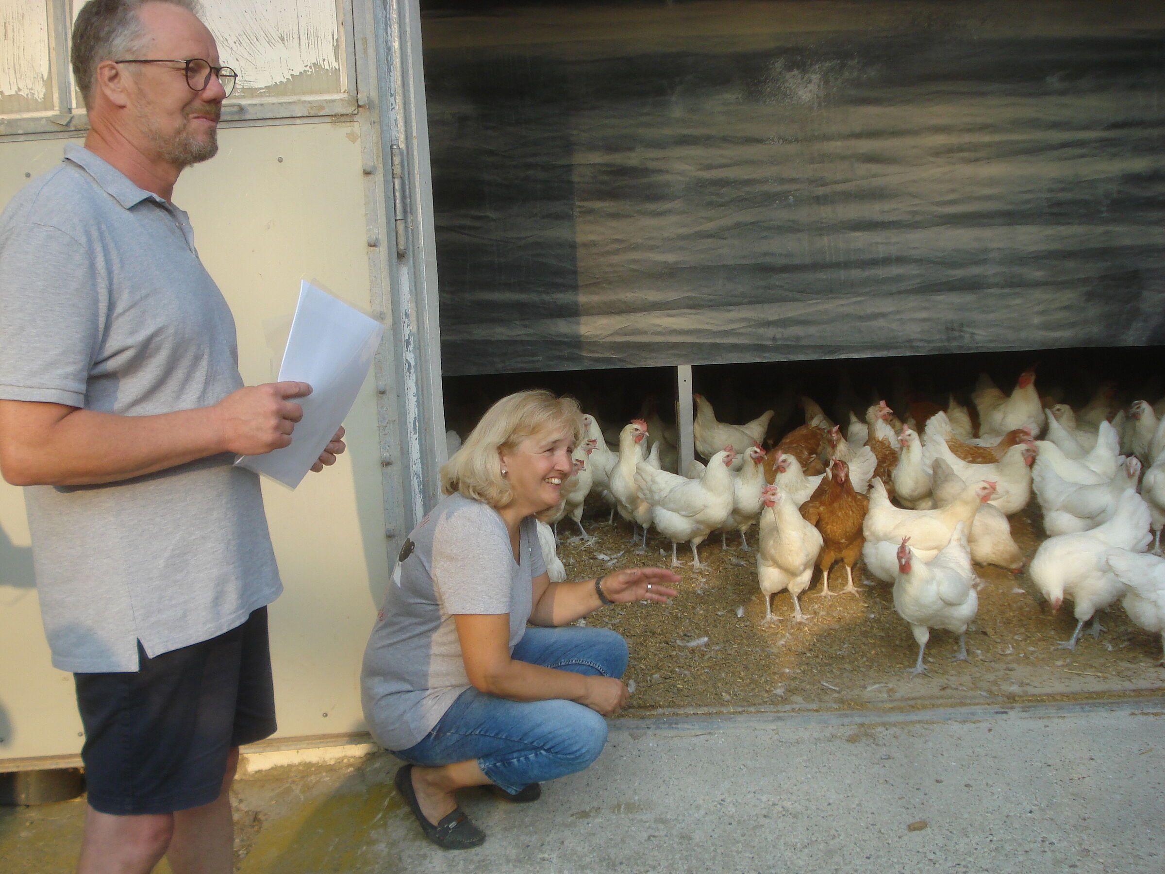 Georg und Christine Steckermeier informierten anschließend die zahlreichen Besucher darüber, dass der Hof mit 13 Hektar landwirtschaftlicher Nutzfläche seit 2007 ökologisch bewirtschaftet werde und Mitglied beim Anbauverband Biokreis sei. Im ehemaligen Milchviehstall würden nun Legehennen nach Bio-Richtlinien gehalten. Dies bedeute, so Steckermeier, mehr Stallfläche für die Hühner, einen Wintergarten und Auslauf ins Freie. Dort habe man sowohl zur Beschattung und zum Schutz der Tiere vor Greifvögeln als auch zur Obstnutzung eine Streuobstwiese angelegt. Aufgestallt würden, so der engagierte Biobauer weiter, Zweinutzungshühner, zur Zeit von den Rassen „Coffee“ und „Cream“. Das heißt, die Legeleistung der Hennen sei etwas geringer, das Schlachtgewicht der männlichen Tiere dafür etwas höher als bei den Hochleistungslegerassen, was in der konventionellen Haltung zur Tötung der männlichen Küken führe. In der Bioszene sei es inzwischen Standard, die männlichen Küken nach dem Schlüpfen aufzuziehen. „Damit sich dieses System aber auf breiter Basis durchsetzt, ist es notwendig, dass die Verbraucher mitmachen und für einen nicht so fleischigen Bruderhahn genau so viel bezahlen, wie für einen Hochleistungsgockel mit breiter „Brust“, verdeutlichte Steckermeier. Die Vermarktung der Eier erfolge über eine Erzeugergemeinschaft und im eigenen Hofladen.