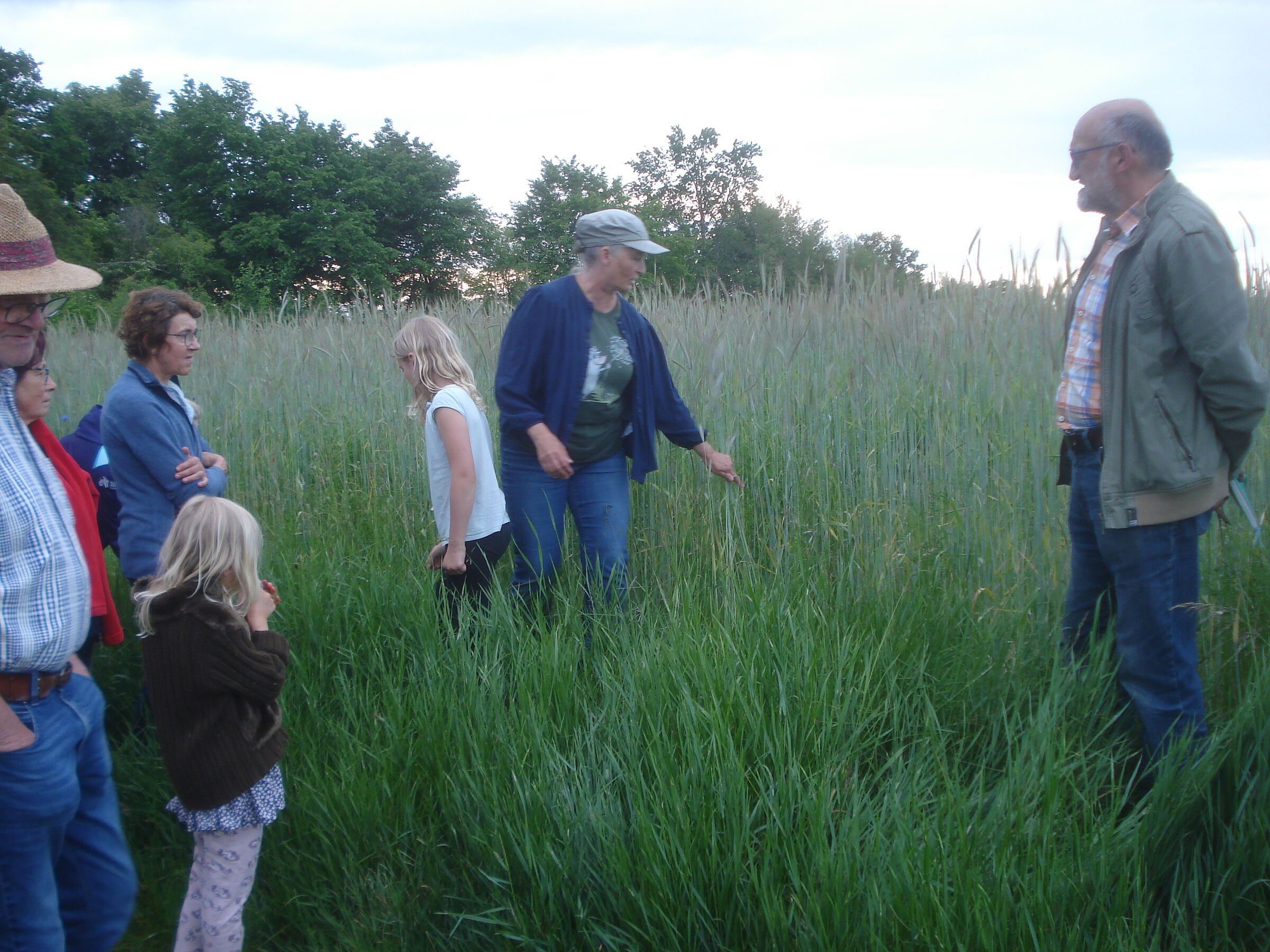 Auf den Ackerflächen liege der Schwerpunkt nicht auf hohen Getreideerträgen, vielmehr wolle man mehr Platz für eine größere Artenvielfalt schaffen, verdeutlichte die engagierte Naturschützerin. Vor einem Roggenfeld wurde gezeigt, wie das gelingen könne. Beim Säen werde nur die Hälfte der üblichen Saatstärke ausgebracht und jedes zweite Säschar geschlossen. Der lichtere Bestand schaffe Platz für Bodenbrüter wie Feldlerche oder Wachtel, und biete auch seltenen Ackerwildkräutern Platz, sich zu entwickeln. So kämen auf ihren Flächen unter anderem Frauenspiegel, Kornrade, wilder Feldsalat oder Ackerwachtelweizen vor, Kulturen, die vom Aussterben bedroht seien, erläuterte Lisa Fleischmann. Nach der Getreideernte gebe es eine Stoppelbrache. Hierbei werde keine Stoppelbearbeitung durchgeführt. Davon profitierten die seltenen Pflanzen und auch viele Tiere. Erst kurz vor der Aussaat der nächsten Hauptkultur werde das Feld gepflügt. Auf allen von der Familie bewirtschafteten Flächen würden Programme des Vertragsnaturschutzes angewendet. Mit den dafür von den Naturschutzbehörden gezahlten Prämien käme man trotz der extensiven Bewirtschaftung noch auf akzeptable Hektarerlöse.