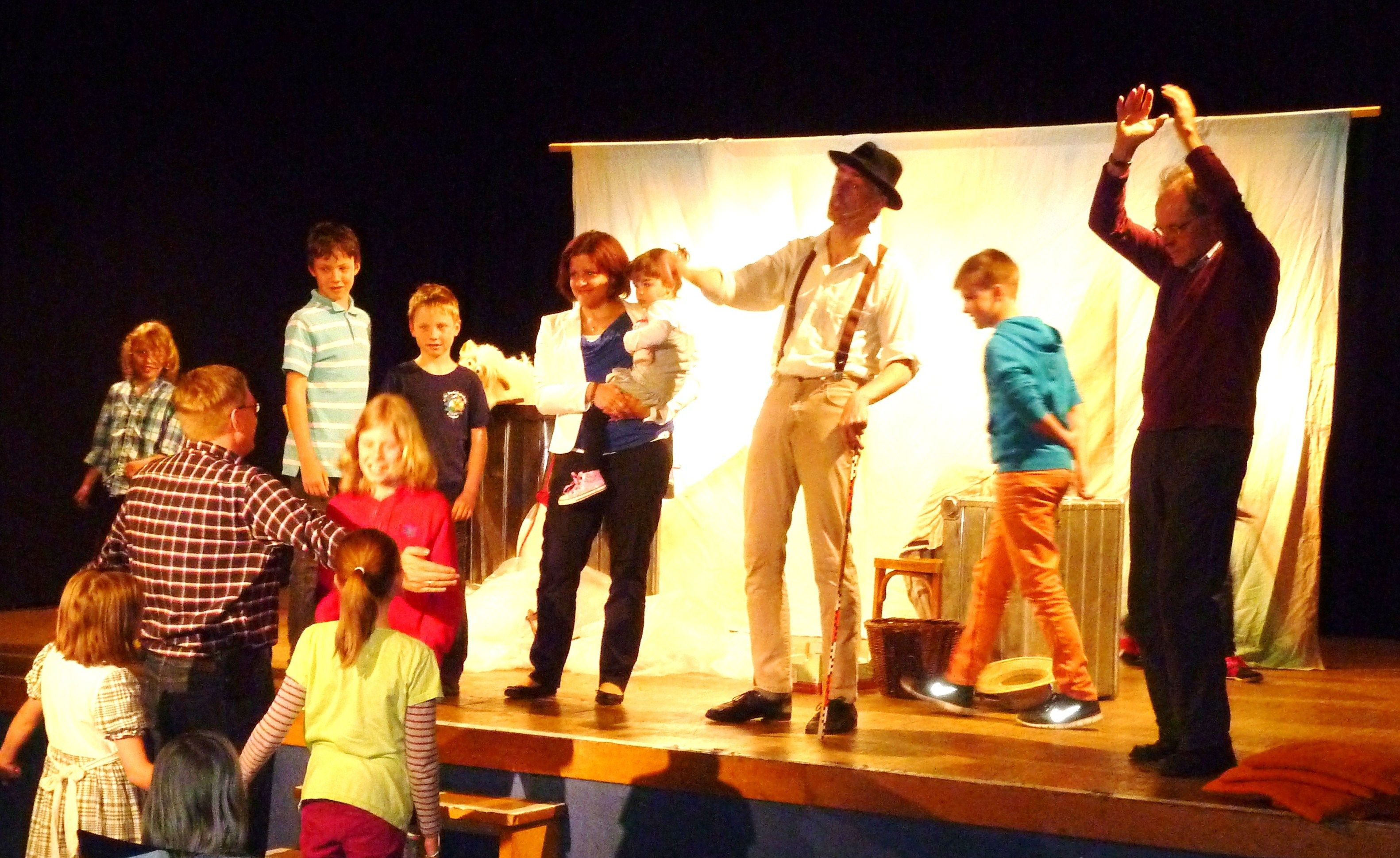 Ganz ohne drohendem Zeigefinger vermittelte ein Schauspieler der Theatergruppe „Die Mimosen“ aus Köln das Thema Umweltschutz und machte die Kinder am eigenen Leib zu Experten für CO2, Konsum und Erderwärmung: da wurden Kinder zur lebenswichtigen Ozonschicht und zu Sonnenstrahlen, zu Autos, Flugzeugen und Industrieanlagen, den Erwachsenen wurde es als Mutter Erde ziemlich warm und das dicke CO2 fühlte sich sichtlich unbehaglich in seiner Rolle. Mit der Unterstützung von Schaf, dem pfiffigen und frechen Begleiter mit dem langen Fell, das Ponguine am Nordpol (!) zu Hilfe ziehen konnte und mit Angela Merkel auf „Du“ war, kamen die Kinder auf ganz viele Ideen, was jeder Einzelne für die Um-Welt tun kann. Wenn wir „die teureren Sachen kaufen, weil die nicht weit weg gemacht werden und von glücklicheren Leuten“, „nicht immer mit dem Flieger in den Urlaub fahren“ und „im Winter keine Erdbeeren und Gurken kaufen“, kurz, wenn die Verbraucher umweltbewusster und nachhaltiger kaufen und damit das Angebot im „Mega-Supermarkt mit seinen unglaublichen Schnäppchen“ verändern, dann darf Tuvalu wieder hoffen.
