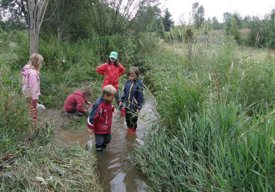 Die Bund-Naturschutz-Kindergruppe Vilsbiburg traf sich am renaturierten Rettenbach. Die Teilnehmer fanden, daß ein Bach nicht nur schöner aussieht wenn er sich schlängeln darf, sondern daß er mit seinen steilen aber auch flachen Uferzonen für viel mehr Pflanzen und Tiere Lebensraum bietet. Die Wasserläufer können Dank ihrer Luftblasen unter den sechs Beinen auf der Wasseroberfläche laufen. Mit Gummistiefeln, Cashern und Becherlupe ausgerüstet wateten die Kinder durch das Wasser und fingen eine Menge Wassertiere. Mit Hilfe von Bildtafeln und Büchern bestimmten die Kinder Bachflohkrebse, Schwimmwanzen und Ruderwanzen. Sie erfuhren, daß diese Tiere nur in relativ sauberem Wasser leben können, nämlich auf der Gewässergüteskala 1-6 in der zweitbesten Gütestufe. Man darf also daraus schließen, daß dieser renaturierte Abschnitt des Rettenbachs in Vilsbiburg ziemlich sauber ist. Zum Schluß durften die Teilnehmer die Wassertierchen durch ein Biokular vergrößert anschauen.