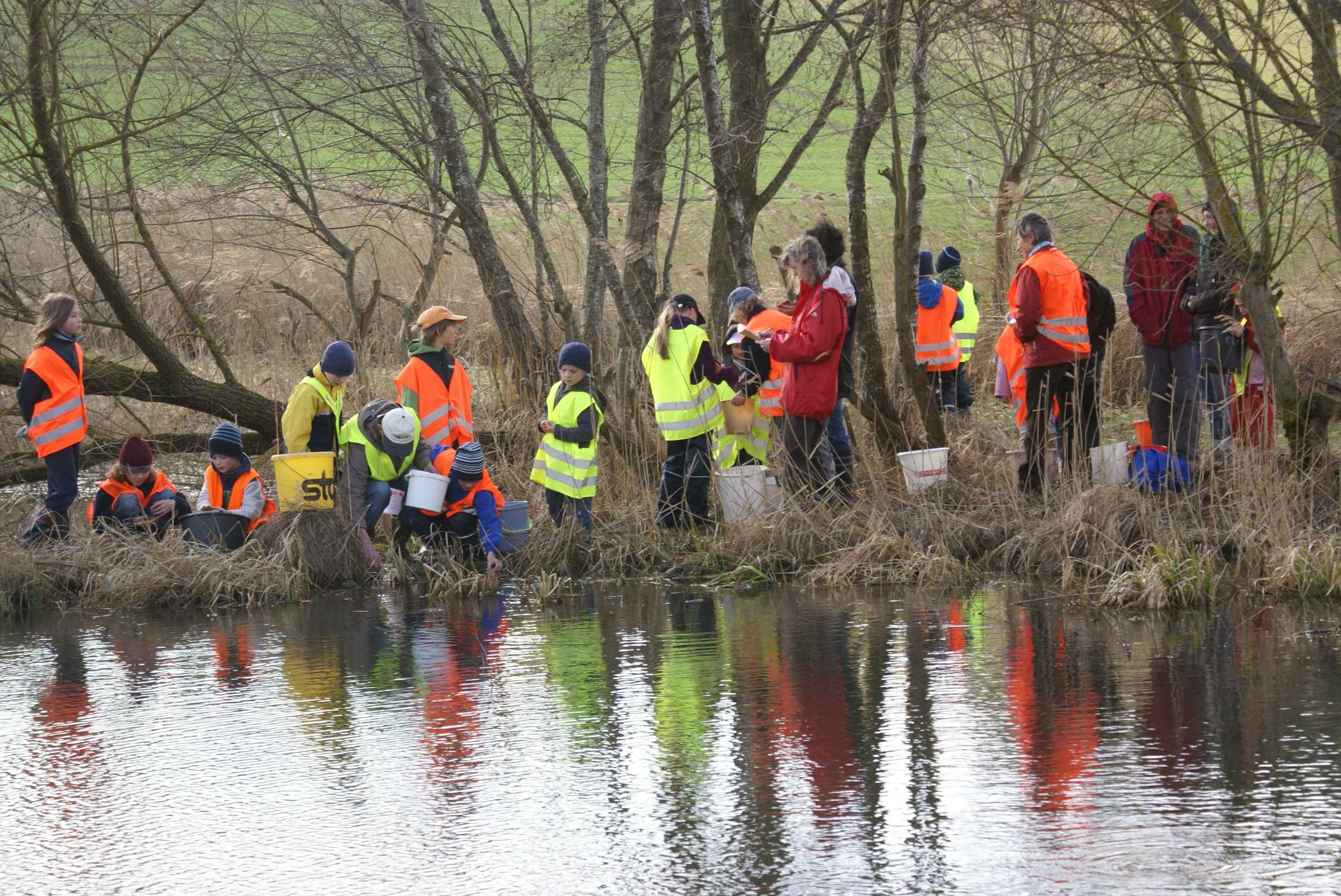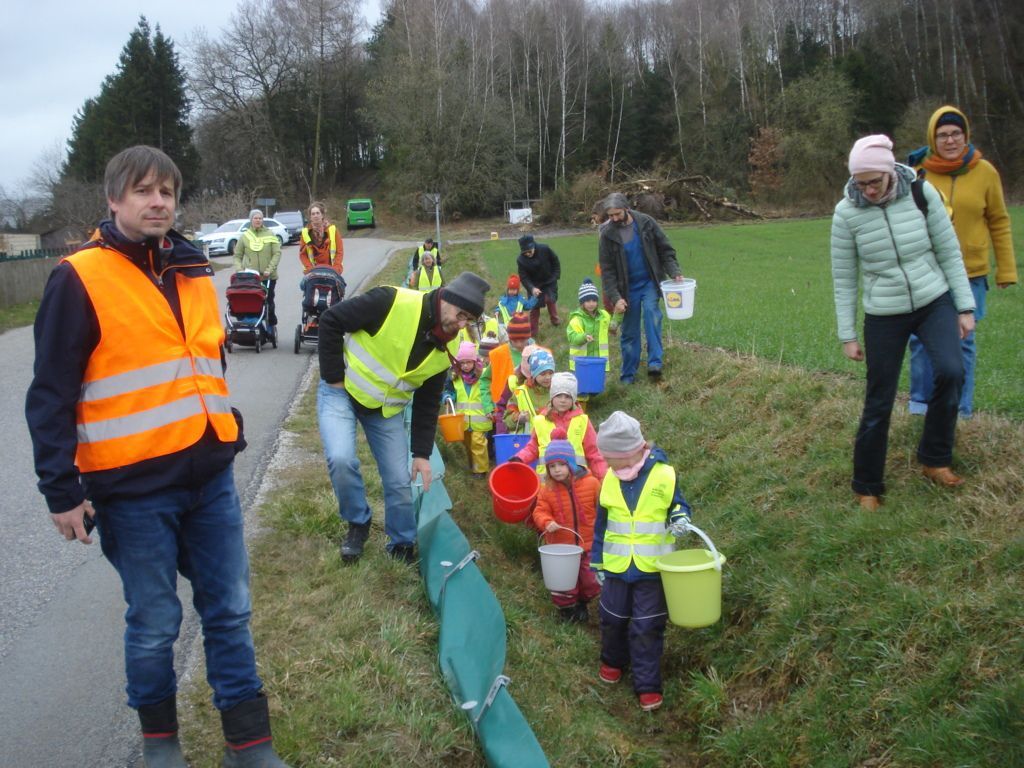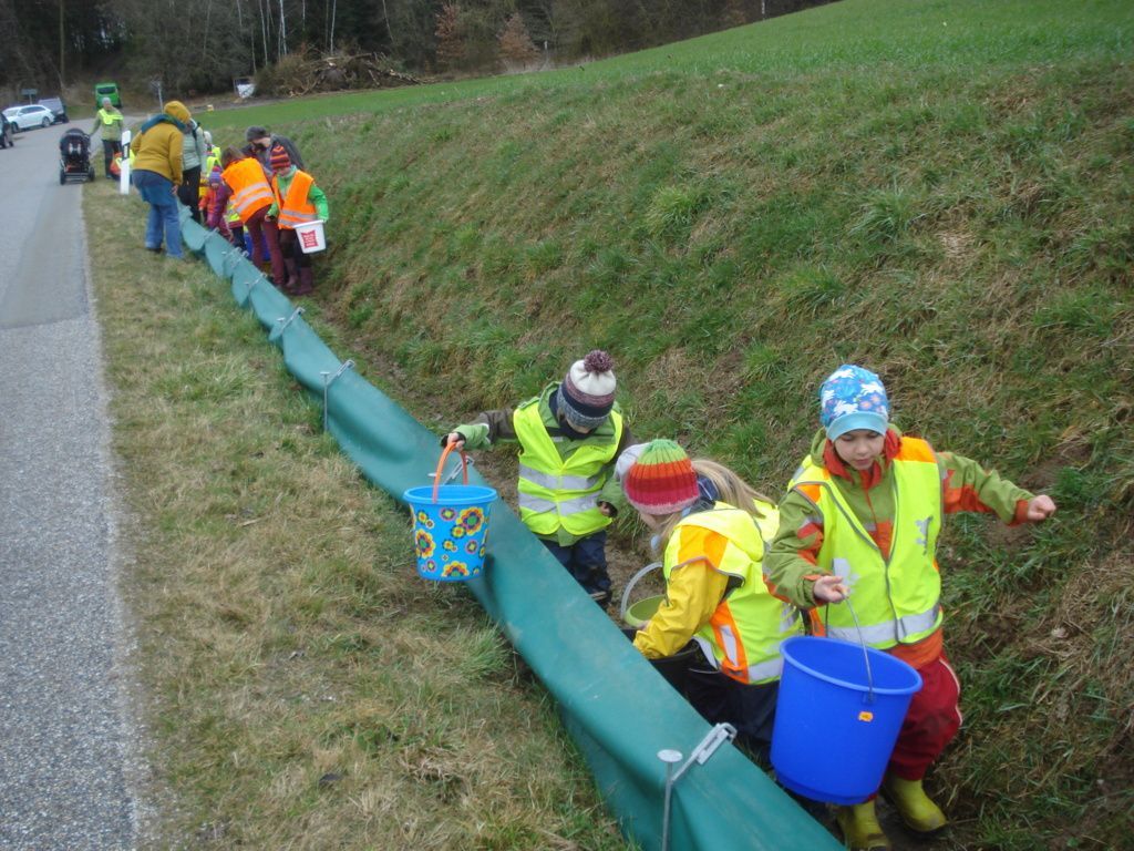 Am Samstag früh waren 14 Kinder eine Stunde mit Feuereifer damit beschäftigt am Dornauer Krötenschutzzaun 96 Erdkrötenmännchen, 15 Krötenweibchen, einen Laubfrosch, fünf Grasfrösche, einen Springfrosch, 58 Teich- und acht Bergmolche einzusammeln und in ihren mitgebrachten Eimern sicher über die Straße zu tragen. Jedes Tier wurde einzeln in den Tümpel entlassen und aufgeschrieben. Im Wasser entdeckten die Kinder schon dicke Laichballen der Grasfrösche und lange schwarze Eischnüre der Erdkröten. Aus den Eiern entwickeln sich in den nächstern Wochen Kaulquappen, die sich allmählich zu Fröschen und Molchen verwandeln und dann an Land gehen, bis sie sich im nächsten März wieder auf den Weg zu ihrem Geburtsort aufmachen werden. Die Kinder freuen sich schon auf ihr nächstes Naturschutztreffen im April, wenn sie ein Insektenhotel einrichten dürfen.