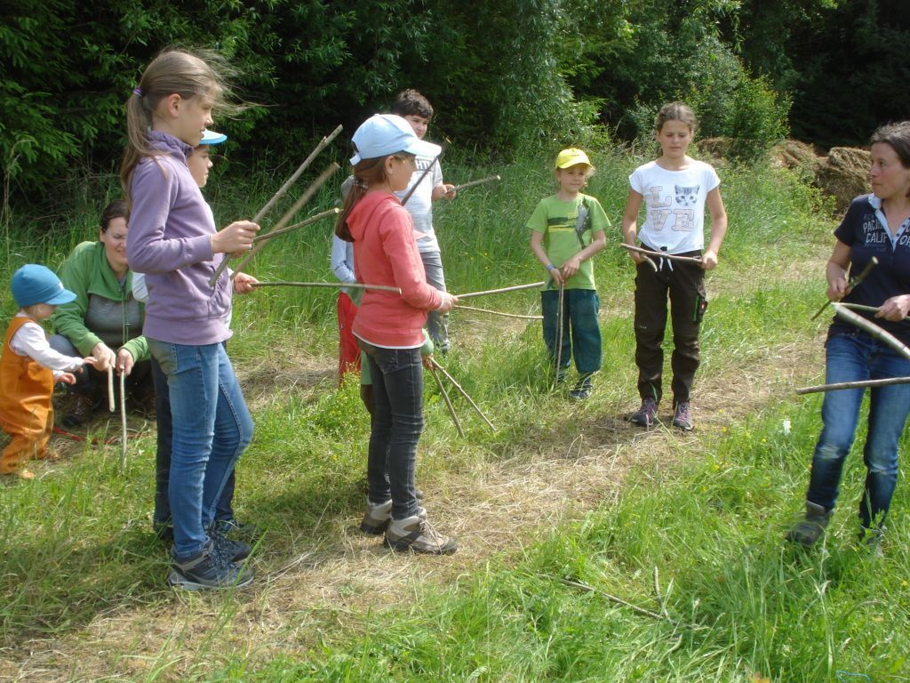 Nun war Geschick gefragt. Kindergruppenleiterin Claudia Weindl bastelte zusammen mit den Kindern „Schwirlwespen“. Schwingt man diese in der Luft, hört es sich an, als komme ein Bienenscharm geflogen. Mutig erwiesen sich die Kinder, als sie danach am Waldrand von einer Erhöhung auf dem Hosenboden auf die darunter liegende Wiese rutschten. Dort tobten sich die Kinder beim Fangerlspielen aus. Zum Schluss war nochmal Geschick gefragt. Bei einer gemeinsamen Aktion lag der lange Stock auf den Zeigefingern der aneinander stehenden Kinder. Er durfte nicht auf den Boden fallen, auch wenn die Zeigefinger bewegt wurden. Nach zwei Stunden holten die Eltern ihre Kinder wieder ab.