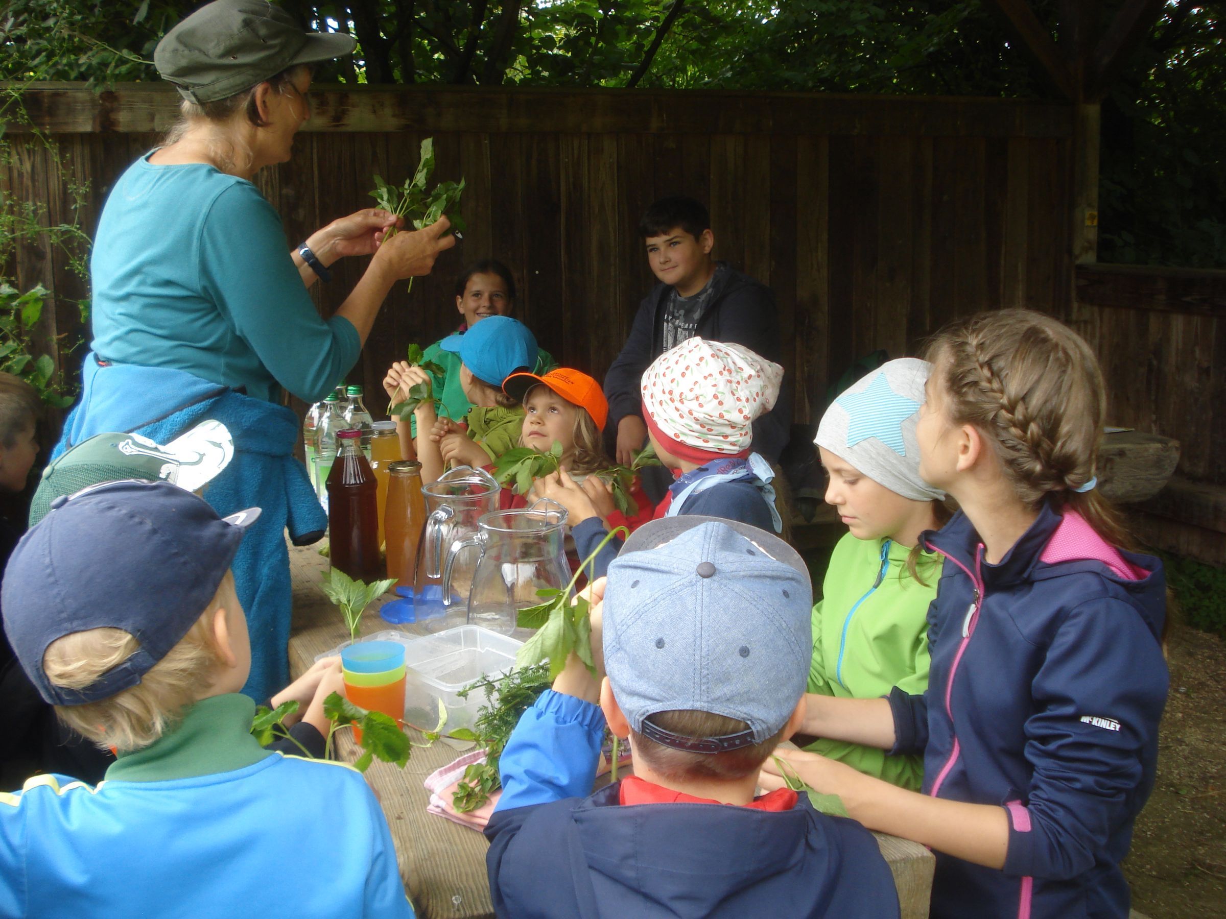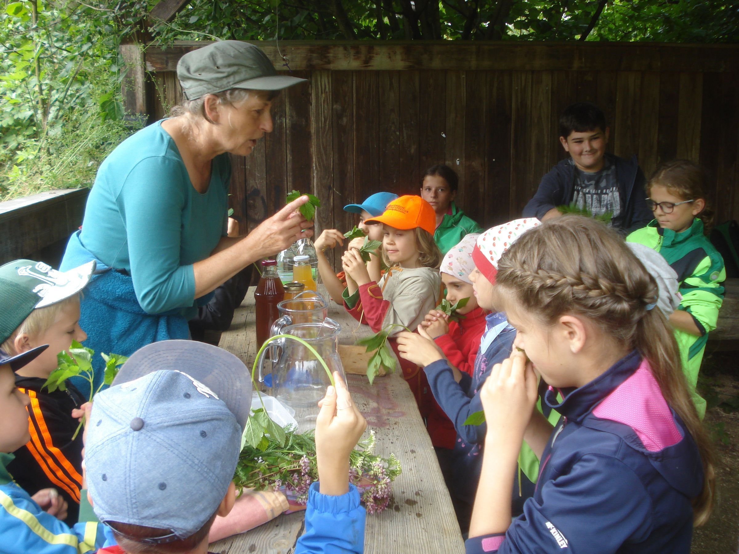 Die Kinder sammelten junge Blätter von Giersch, Baldrian, Wiesenknopf, Brennessel und die süß nach Honig duftenden Blüten des Mädesüß.