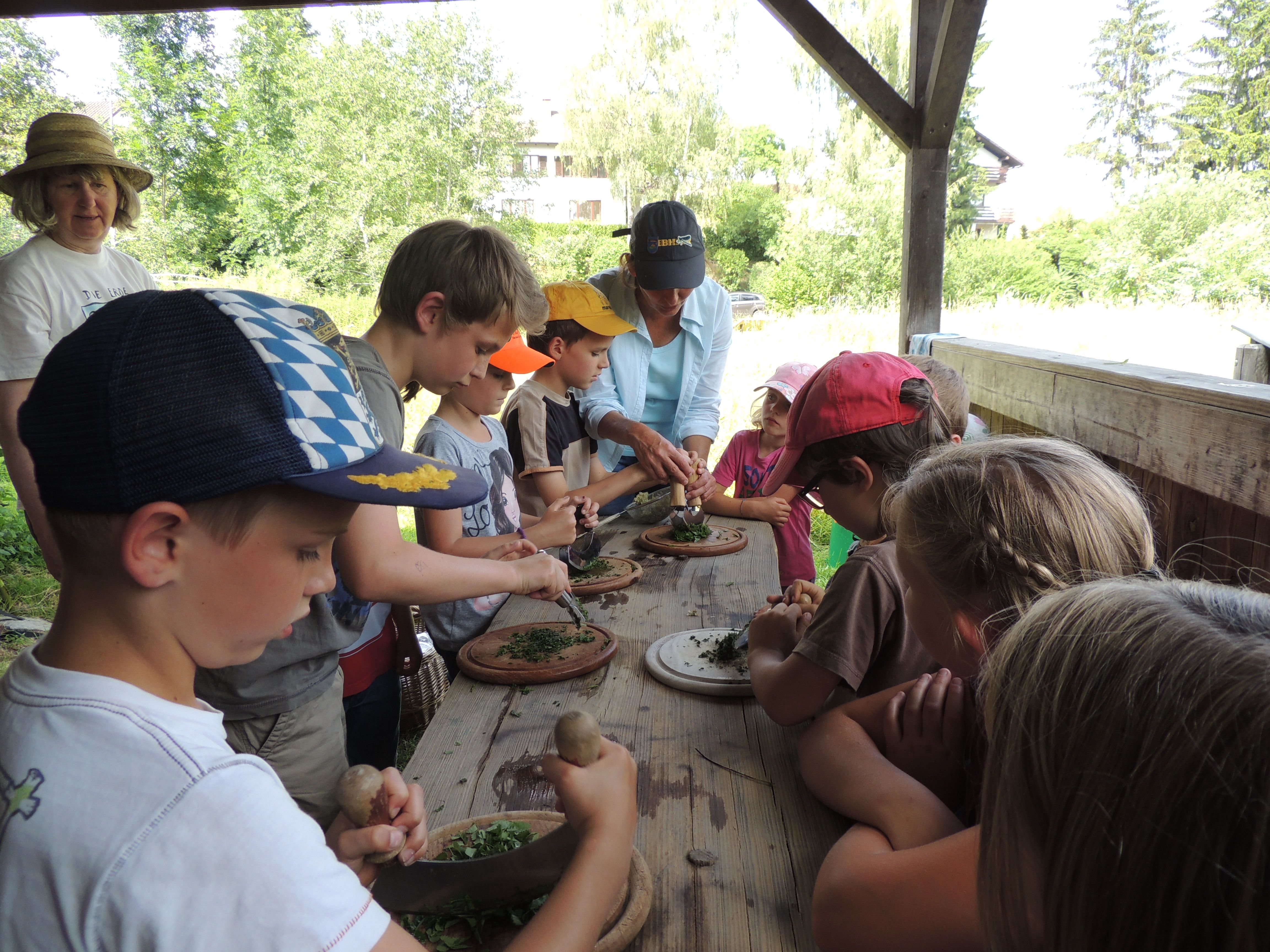 Vilsbiburg. Beim Treffen der BN-Kindergruppe „Die Buntspechte“ im Juli war das Kennenlernen von Kräutern angesagt. Die Kinder mit ihren Kindergruppenleiterinnen und –leiter trafen sich mit Umweltpädagogin Lisa Fleischmann am Rettenbach am Naturlehrpfad. Als erstes lernten die Kinder den Giersch kennen. Er ist bei manchen Menschen nicht gerne im Garten gesehen, hat aber erstaunliche Eigenschaften. Der Stängel hat die Form einer Regenrinne, weiter oben bei der Blüte ist er rund und hohl. Die Kinder schnitten Stücke ab und hatten sogleich „Naturstrohhalme“. Fleischmann zeigte Schafgarbe und den Wilden Majoran. Eifrig wurden sie nach dem Händewaschen zusammen mit sauberem Giersch zwischen den Händen gerieben und bildeten einen starken Duft. Schnell alles in eine Karaffe gegeben und mit Birnen- und Apfelsaft aufgegossen, sollte diese Mischung am Ende der Stunde ein schmackhaftes Getränk ergeben.