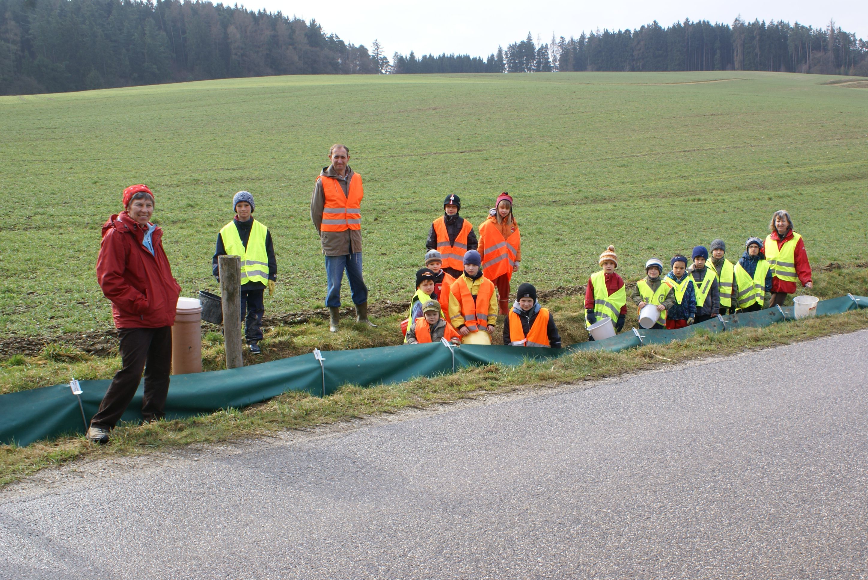 Deshalb besuchten auch die Bund Naturschutz Kindergruppen Geisenhausen und die neue Kindergruppe Vilsbiburg den Amphibienzaun in Dornau um beim Umtragen der Kröten, Frösche und Molche mitzuhelfen. Dabei erfuhren sie von Brigitte und Stefan Englbrecht von der BN Ortsgruppe Vilsbiburg viel Wissenswertes über die Lebensweise diese kleinen Lurche. Das spannendste für die Kinder war natürlich, selber am Zaun entlang zu gehen und die die Kröten und Molche aus den eingegrabenen Eimern heraus zu holen. In den mitgebrachten Eimern wurden die Tiere auf die andere Straßenseite getragen und am nahe gelegenen Teich wieder frei gelassen. Da das Wetter günstig war, konnten an den beiden Tagen über dreihundert Erdkröten, Teich- und Bergmolche und ein Springfrosch gezählt werden. Der ebenfalls vorkommende Grasfrosch sowie der seltene Laubfrosch waren gerade nicht unterwegs.