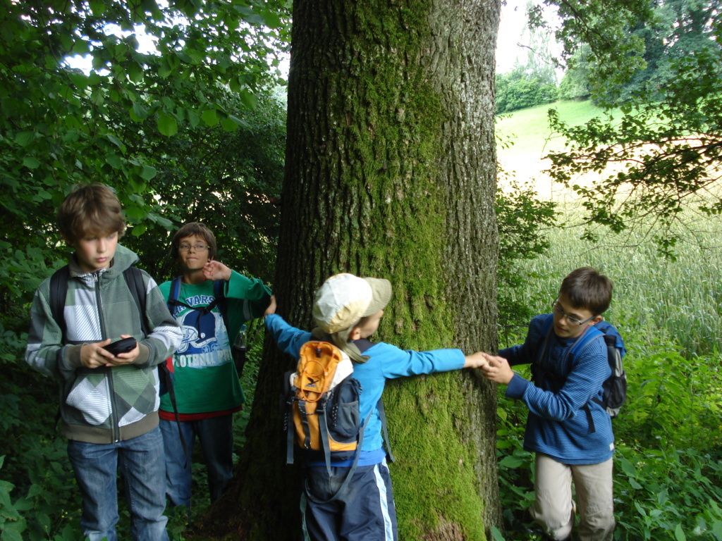 Bei der dicksten Esche konnten die Kinder den Stamm zu fünft mit ihren Armen gerade umspannen. Weil dieser alte Laubwald in unserer Gegend etwas ganz besonderes ist, wurde er unter Naturschutz gestellt.
