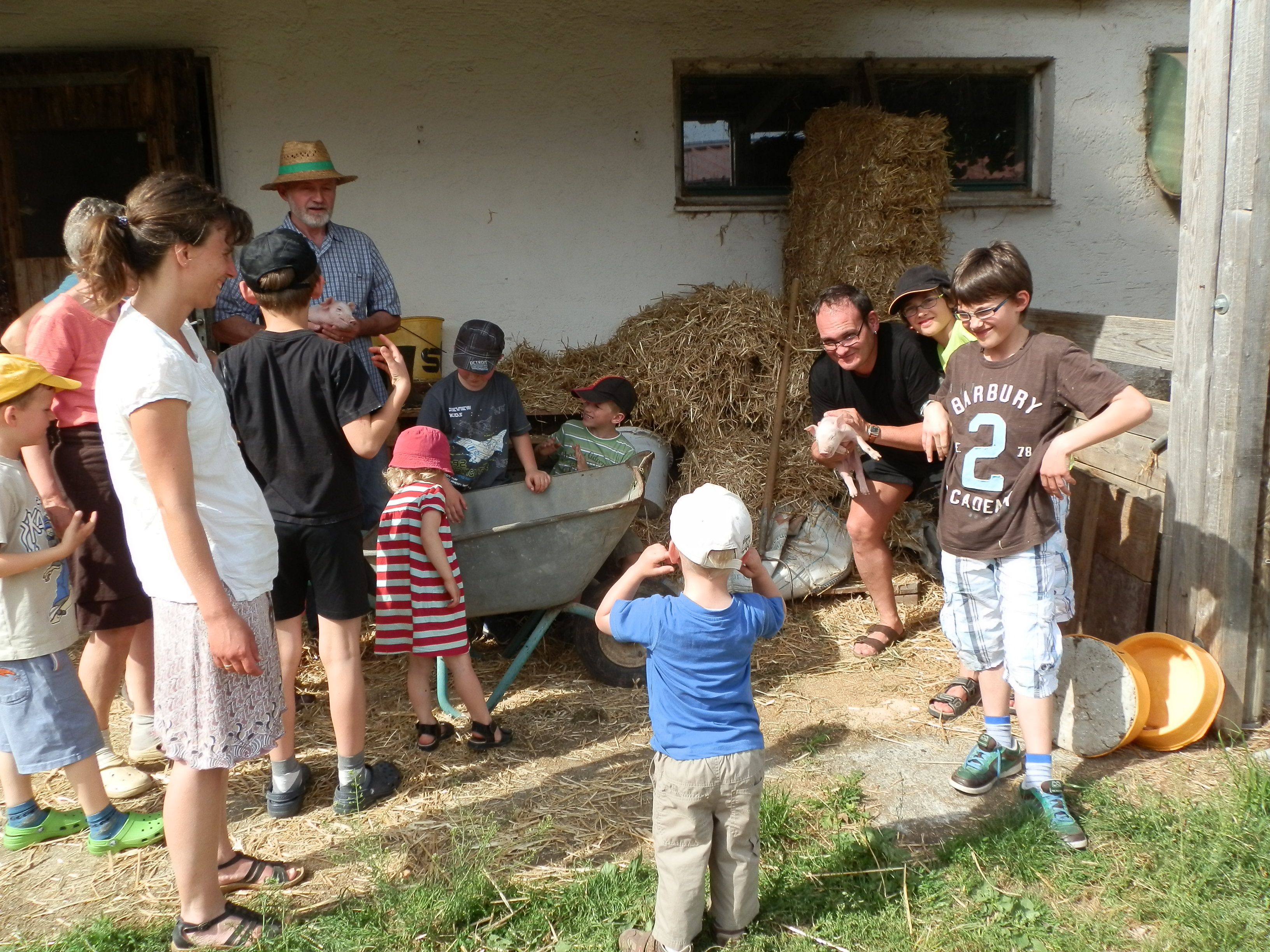 Besonders viel Spaß machte den Teilnehmern der Bund Naturchutz Kindergruppe Vilsbiburg ein Besuch des Naturlandhofes der Familie Schmid in Grammelsbrunn. Mit Begeisterung warfen die Kinder frisches Gras in die Freilandboxen der Muttersauen und lockten sie aus dem Stall. Sie durften einige kleine Ferkel zum Streicheln auf den Arm nehmen. Allerdings quiekten diese so laut weil sie schnell wieder zu ihren Müttern und Geschwistern wollten.