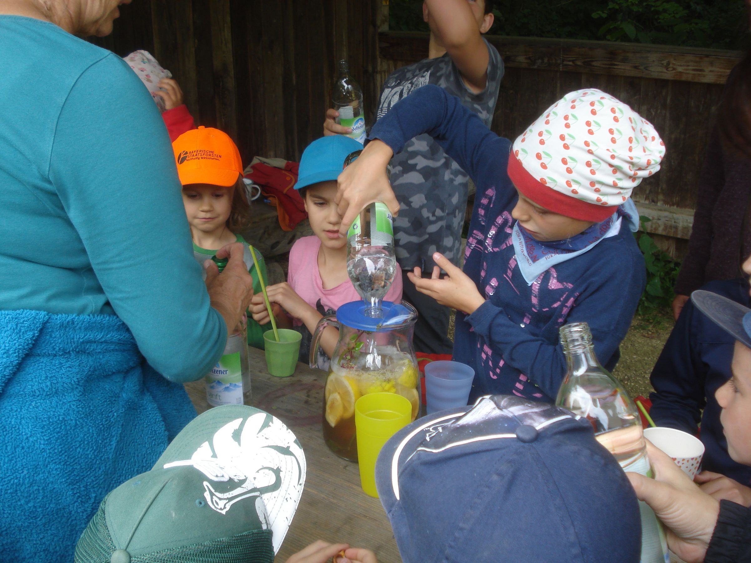 Das selbst zubereitete Getränk hatte nun gezogen und war fertig. Mit ihren „Strohhalmen“ aus Giersch ließen sich die Kinder den Saft schmecken. Die Kräuter gaben dem Getränk eine sehr schmackhafte Note, stellten sowohl die Kinder als auch die Kindergruppenleiterinnen und –leiter fest.