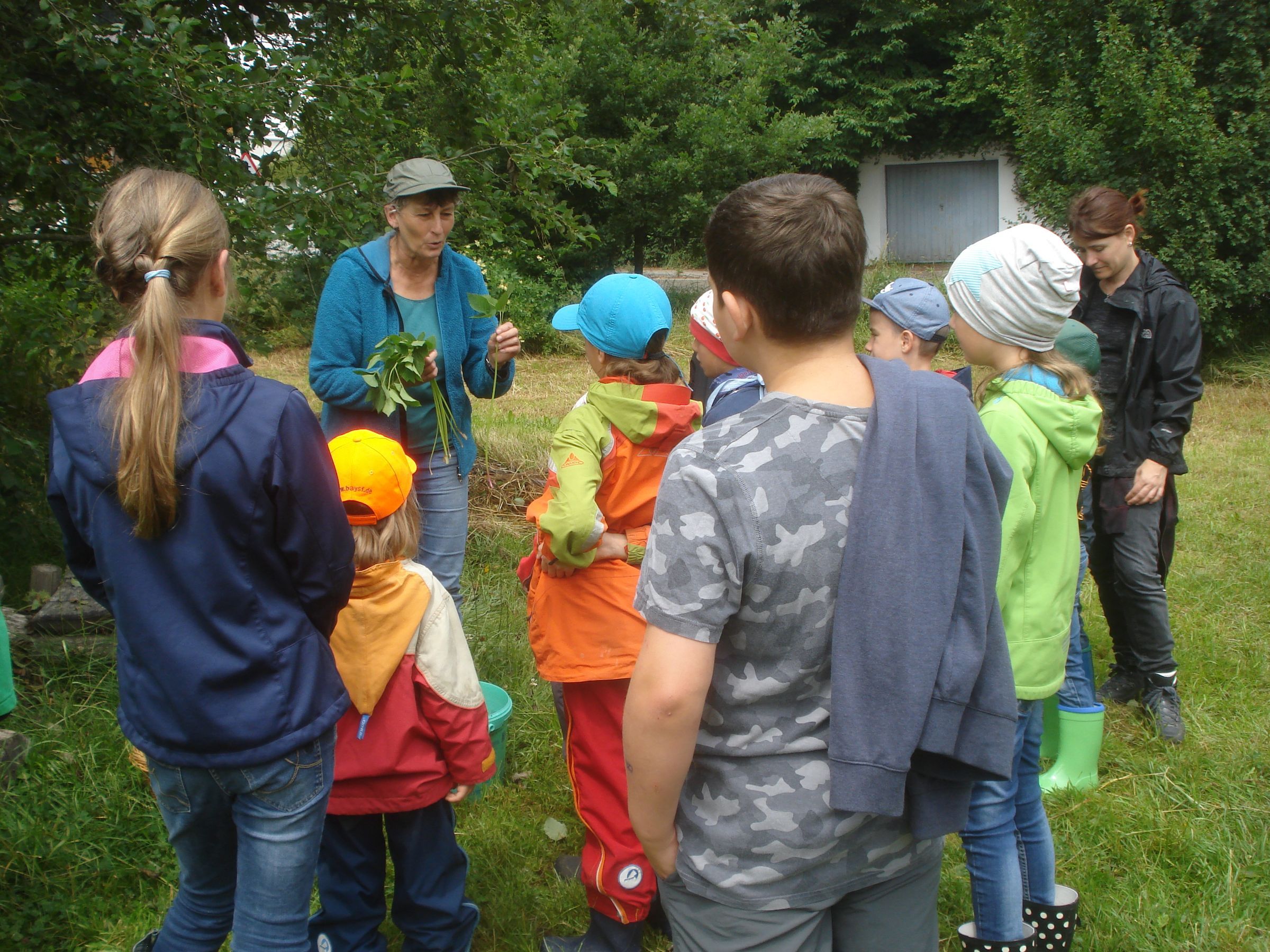 Fleischmann zeigte den Wiesenbärenklau. Er hat einen kantigen und rauen Stängel. Die Blätter sehen aus wie Bärentatzen. Man sagt zu dieser Pflanze auch Krähenhaxen oder ein alter Name ist auch „Scharling“. Wahrscheinlich schon die alten Neandertaler haben die Blätter vom Wiesenbärenklau gesammelt und als Salat gegessen. Aus den Stängeln könne man schmackhafte „Gummibeeren“ machen. Die Pädagogin ließ die interessierten Kinder einige mitgebrachte probieren.