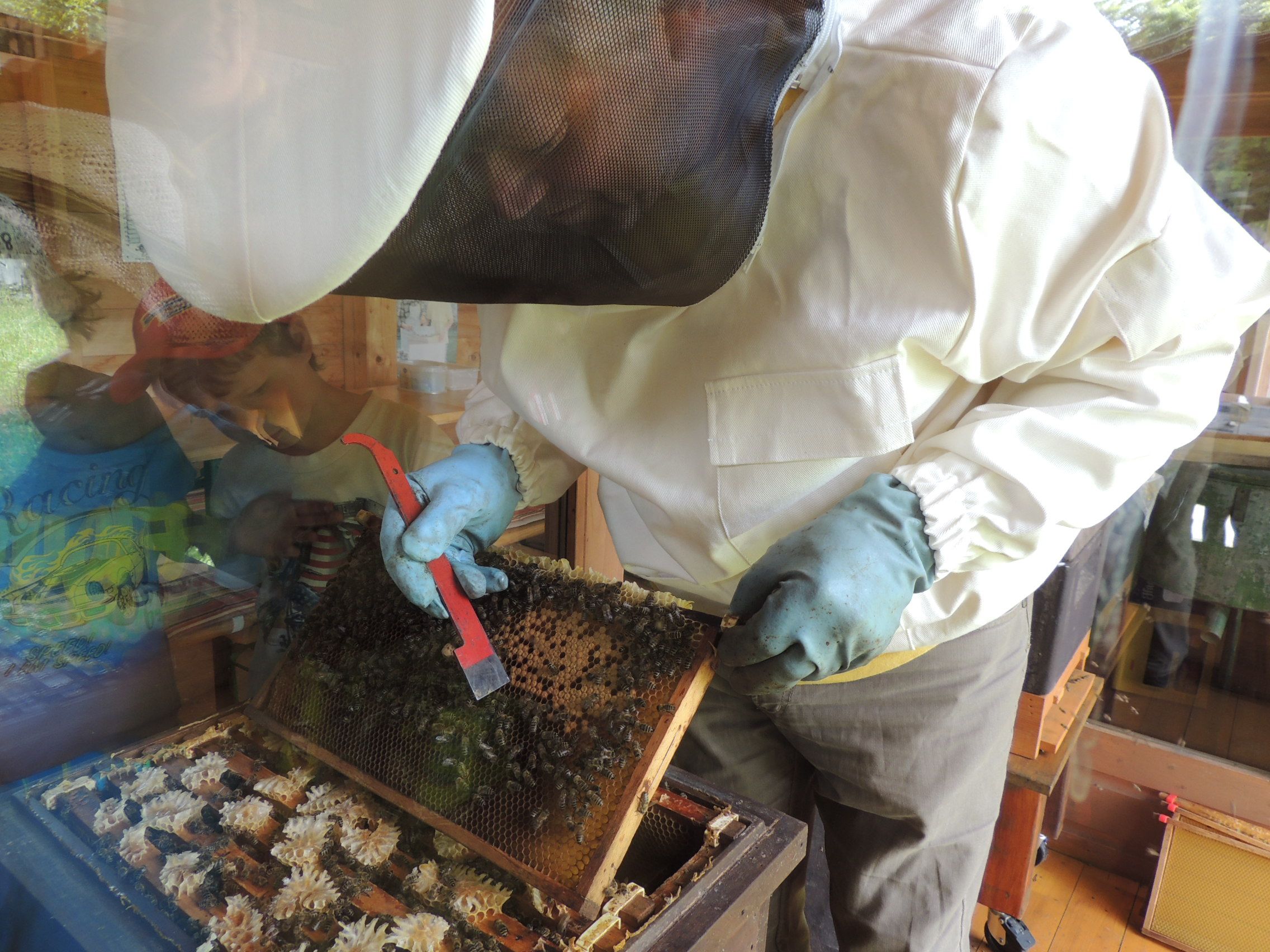 Herr Lehrhuber schlüpfte in seine Schutzkleidung und, von einer Glaswand vor Stichen geschützt, durften die Besucher zusehen, wie er aus einem Kasten die Rahmen herauszog. Aus Drüsen schwitzen die Arbeiterinnen Wachs aus und bauen daraus ihre sechseckigen Waben. In den mittleren Waben liegen die Eier und Larven. Diese werden von den Arbeiterinnen 21 Tage lang gefüttert bis sie fertige Bienen sind. Nur wenige Larven werden mit Gelee royal gefüttert, damit sie sich zu jungen Königinnen entwickeln. In die übrigen Waben tragen die Nektarbienen die Honigvorräte ein. Eine Hausbiene fliegt nur bei Sonnenschein und bis zu drei Kilometer weit. Es wäre nicht nur schöner, wenn unsere Landschaft blütenreicher wäre, sondern die Bienen fänden den ganzen Sommer lang auseichend Nahrung.