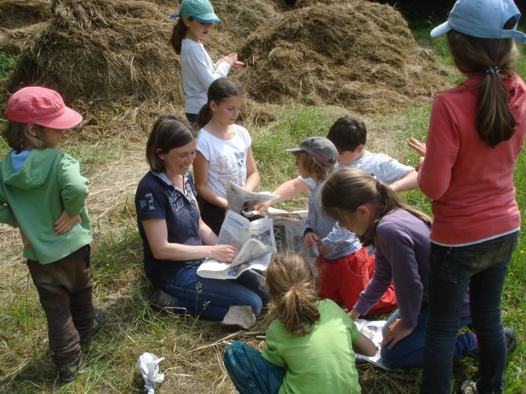 Auch die Störche lieben Wiesen, deshalb fragte Weindl: wie klappert ein Storch? Die Kinder machten das Geräusch mit Zusammenschlagen von zwei Stöcken nach, was erstaunlich echt klang. Spielen war wieder angesagt, und die Kinder durften sich auf feuchtem Heu, das zu Haufen zusammengetragen war, austoben. Am Schluss der zwei Stunden, die zu schnell vergingen, bastelten die Kinder Samenkugeln aus Ton und Samen. Die Samen sollen sich im Garten der Kinder, wenn sie dort ausgebracht werden, zu schönen Blumen entwickeln.