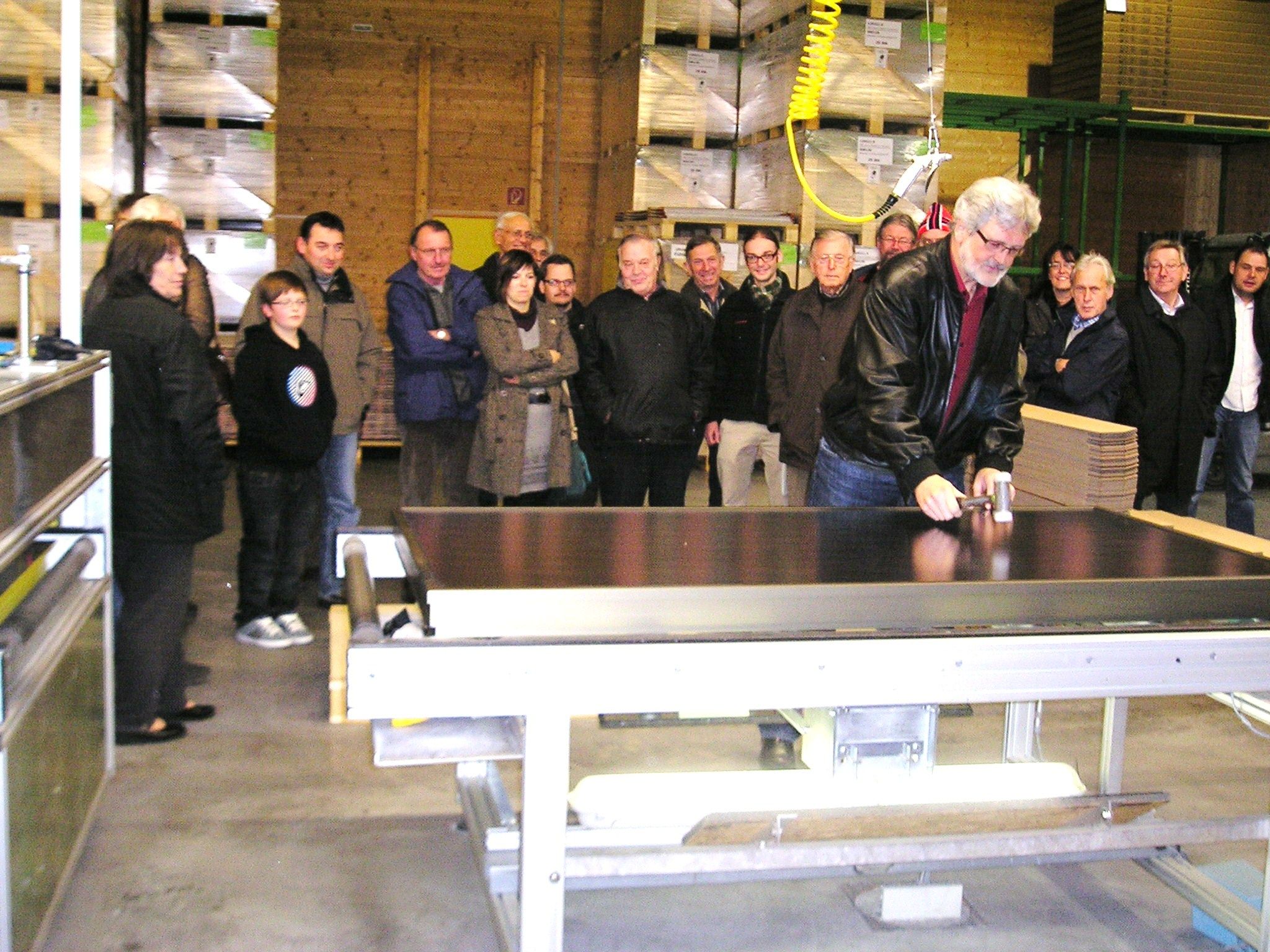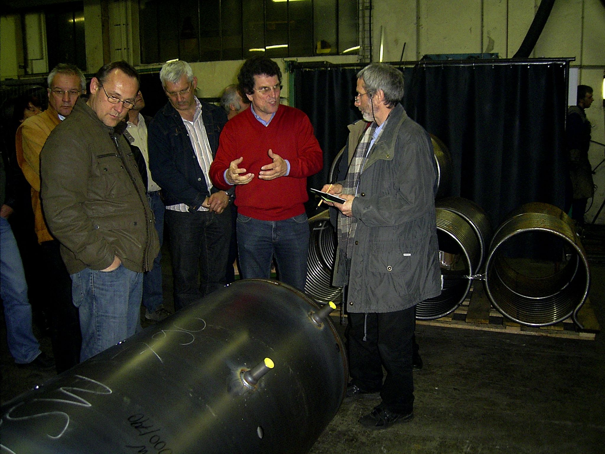 Nach der Begrüßung durch Werksleiter Hanns Koller und Verkaufsleiter Reinhard Graf wurden die etwa 50 Besucher in zwei Gruppen aufgeteilt und durch das Werk geführt. So wurde zunächst die Fertigung der verschiedenen Speicher genau erklärt. Dabei unterscheidet man zwischen reinen Warmwasserspeichern, Pufferspeichern mit und ohne Schichtbeladung und so genannten Kombispeichern. Durch die eigene Fertigung könne man ohne großen Aufwand auf besondere Kundenwünsche eingehen wie etwa Sondergrößen im Durchmesser und in der Bauhöhe, betonten die Firmenvertreter. Highlight der Besichtigung war sicher die roboterunterstützte Fertigung von Flachkollektoren. Nur durch diesen hohen Grad an Automatisierung könnten die Arbeitsplätze in der Region gehalten und eine gleich bleibende hohe Qualität gesichert werden, worauf man sehr stolz sei.