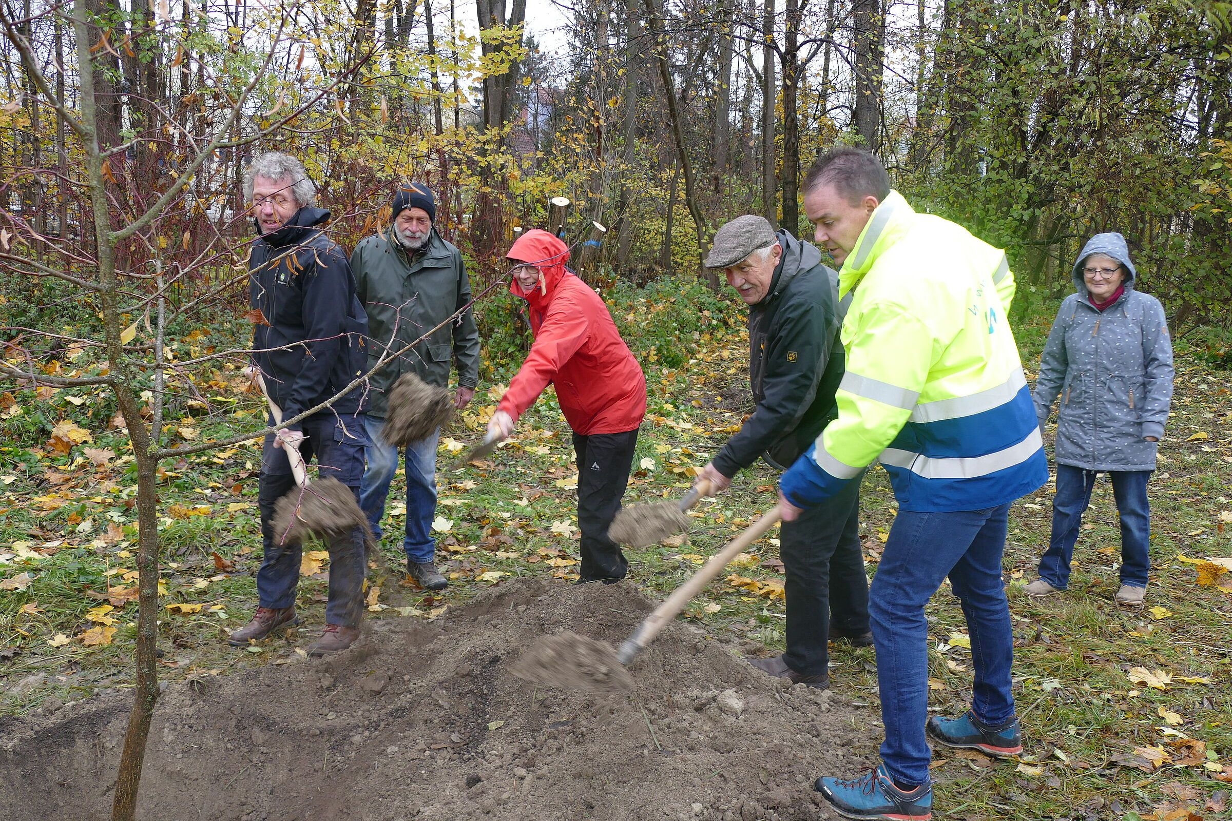 Dann griffen die anwesenden BN - Aktiven und der Amtsleiter des Wasserwirtschafts-amtes Landshut, Patrik Giebel, zu den Schaufeln, um das von der Flussmeisterstelle Landshut vorbereitete Pflanzloch um den Baum herum wieder zu füllen und den Baum anschließend zu begießen. Es folgte eine kleine Ansprache zur Linde, dem Symbolbaum des BUND Naturschutz in Bayern e. V..