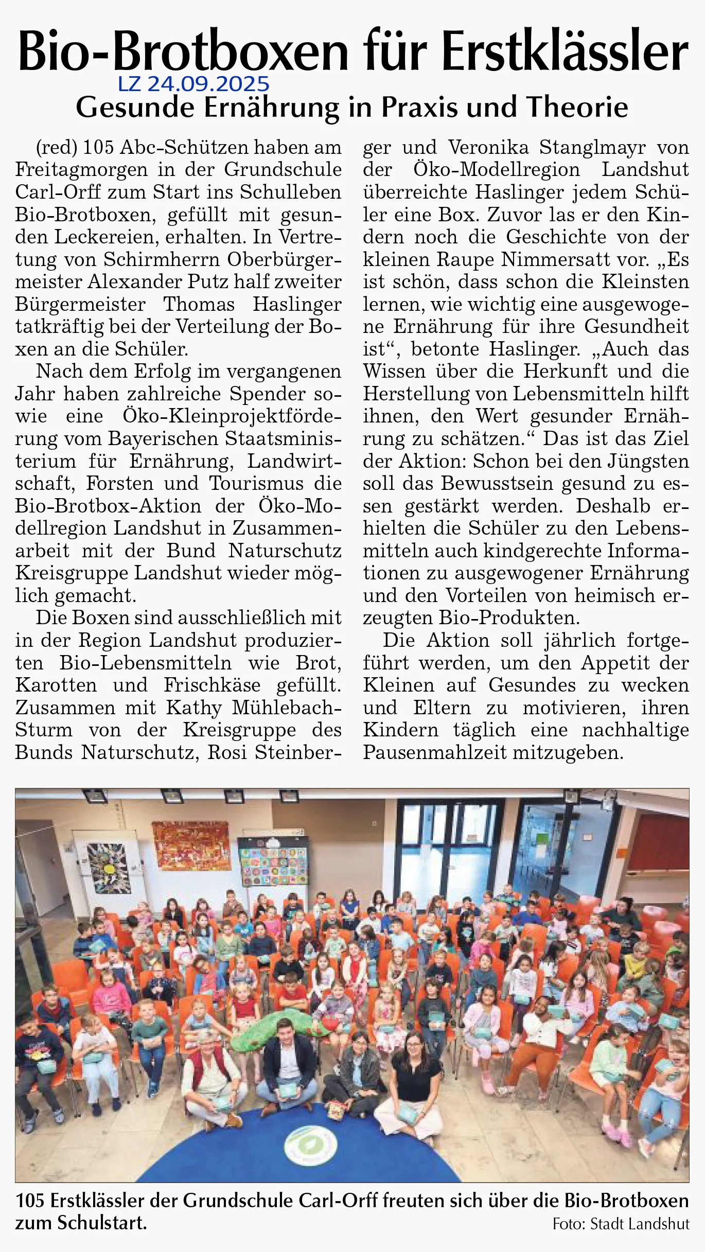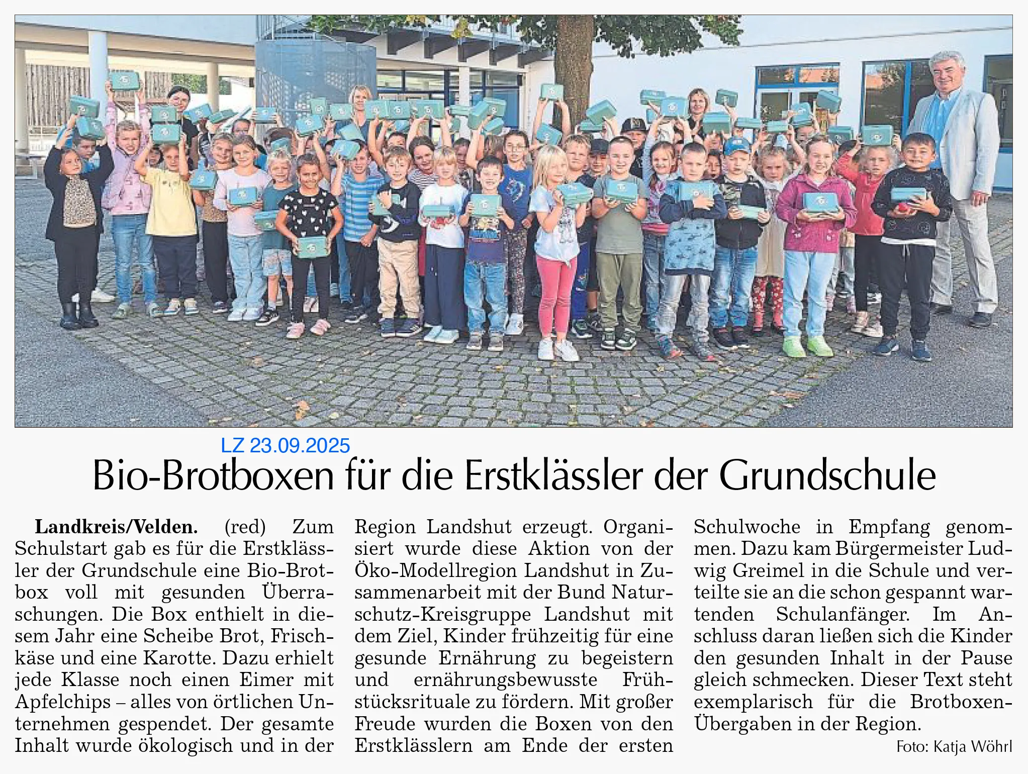 Die Ökomodellregion Landshut konnte nun zum zweiten Mal eine Bio-Brotboxaktion durchführen. Befüllt wurden die Boxen mit Lebensmitteln, die zu 100% in der Ökomodellregion Landshut produziert wurden. Die Erstklässler freuten sich über die Brotzeit. In einem beiliegenden Schreiben wurden die Eltern über diese Aktion der Ökomodellregion Landshut informiert, verbunden mit der Anregung, ihrem Kind täglich eine gesunde Biobrotzeit möglichst ohne Verpackung(-smüll) in die Schule mitzugeben.
