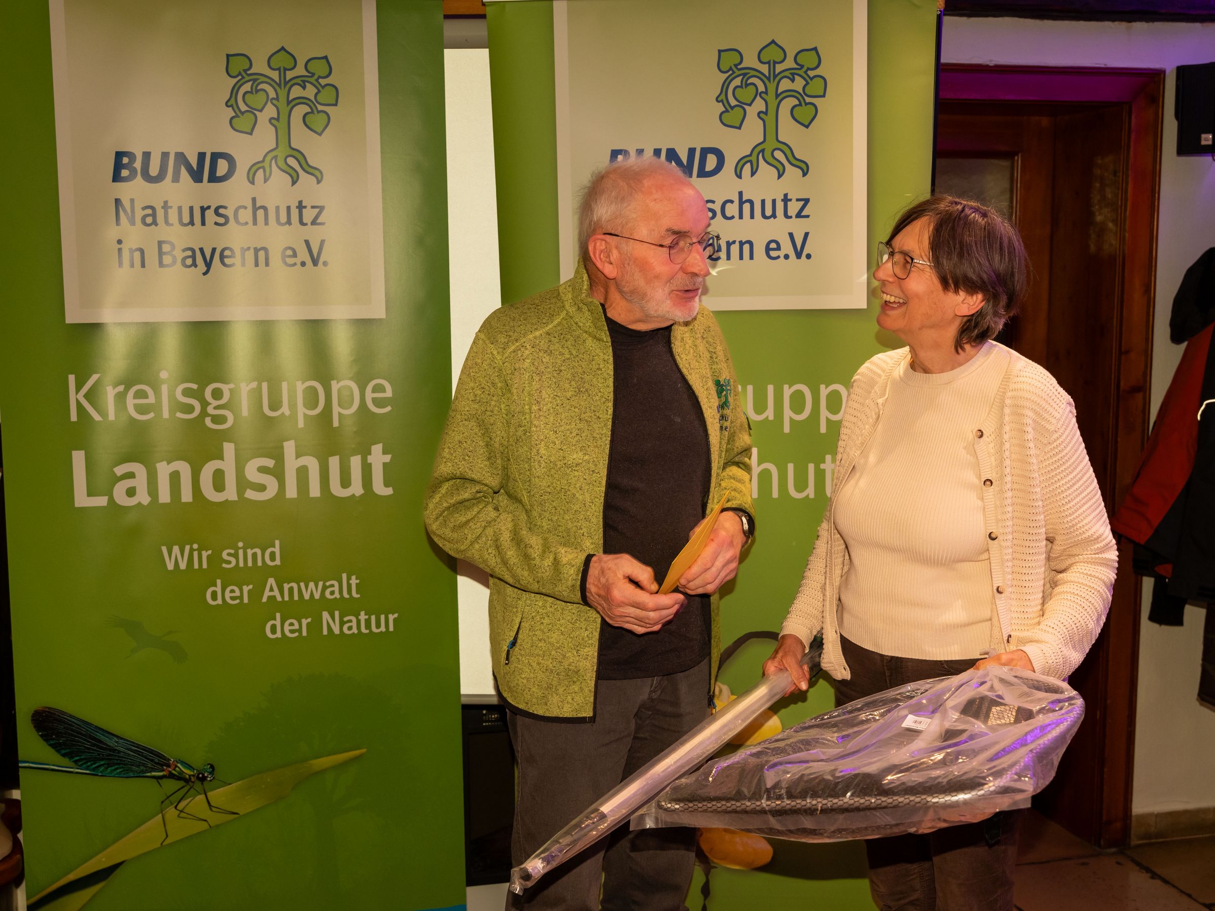 Herr Prof. Dr. Stöcklein wurde für seine 50-jährige Treue zum BN mit der Vereinsnadel in Gold geehrt. In einer kleinen Ansprache erinnerte er an seinen langjährigen Freund Paul Riederer. Paul habe über sein jahrzehntelanges Wirken als Kreisvorsitzender viele Mitglieder für den BN gewonnen und fünfzehn BN-Ortsgruppen im gesamten Landkreis Landshut aufgebaut. Er habe so die Kreisgruppe zu dem gemacht, was sie heute ist. Dass der ehemalige Standortübungsplatz Landshut mit Isarleite heute als überragendes Naturschutzgebiet zum Lebensraum für viele Tiere und Pflanzen geworden ist, sei Pauls größter Verdienst.