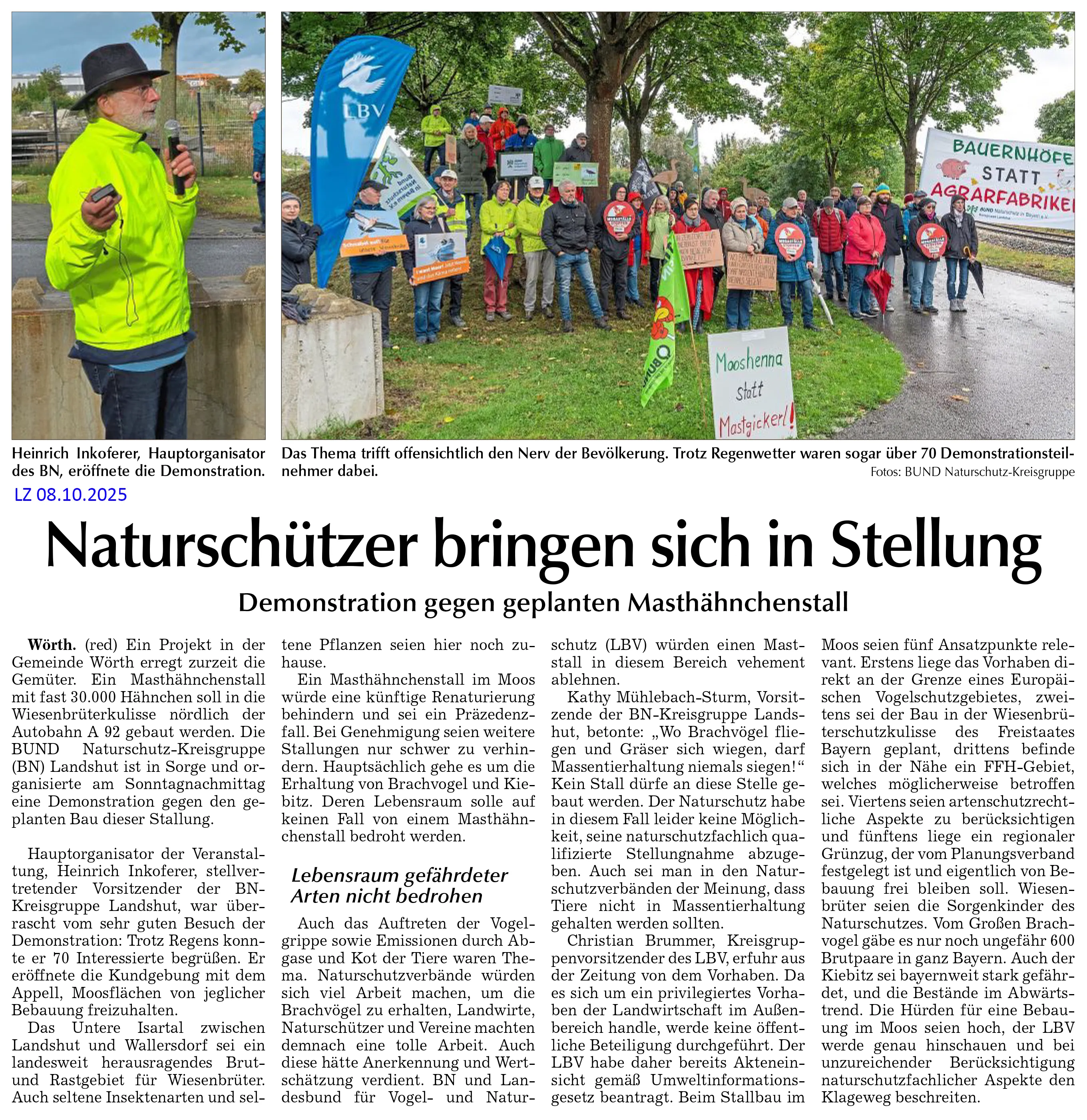 Hauptorganisator der Veranstaltung, Heinrich Inkoferer, ist stellvertretender Vorsitzender der BN-Kreisgruppe Landshut. Er war überrascht vom sehr guten Besuch der Demonstration, trotz Regen konnte er 70 Interessierte begrüßen. Er eröffnete die Kundgebung mit dem Appell, Moosflächen von jeglicher Bebauung freizuhalten. Ein Masthähnchenstall im Moos würde eine künftige Renaturierung behindern und sei ein Präzedenzfall. Bei Genehmigung dieses Stalles seien weitere Stallungen nur sehr schwer zu verhindern. Hauptsächlich gehe es um die Erhaltung von Brachvogel und Kiebitz. Deren Lebensraum solle auf keinen Fall von einem Masthähnchenstall bedroht werden. Auch das Auftreten der Vogelgrippe sowie Emissionen durch Abgase und Kot der Tiere waren Thema. Naturschutzverbände würden sich unheimlich viel Arbeit machen, um die Brachvögel zu erhalten. Nicht nur Landwirte, auch Naturschützer und Vereine machten tolle Arbeit. Auch diese hätte Anerkennung und Wertschätzung verdient. BN und Landesbund für Vogel- und Naturschutz (LBV) würden einen Maststall in diesem Bereich vehement ablehnen.