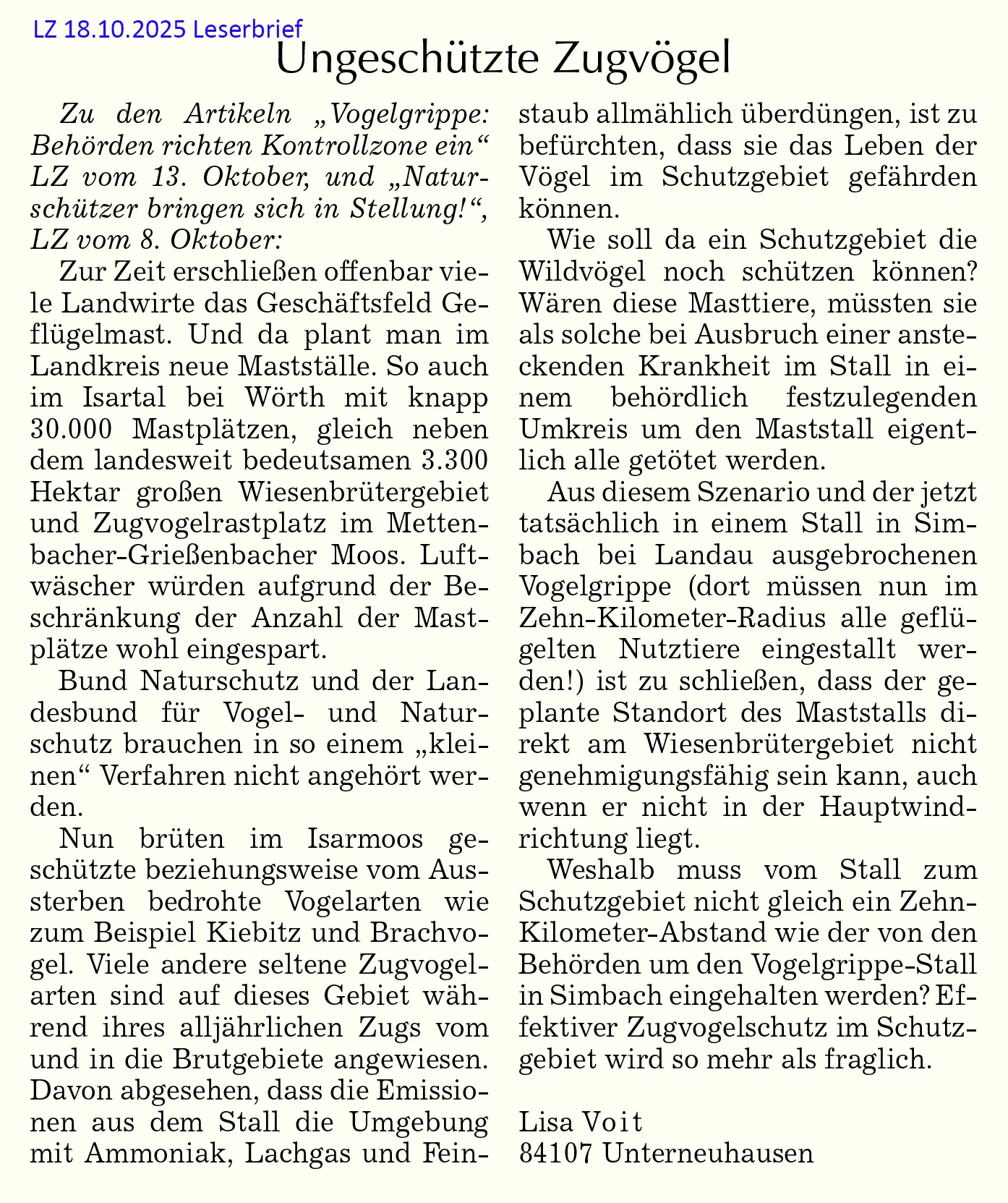 Christian Brummer, Kreisgruppenvorsitzender des LBV, erfuhr aus der Zeitung von dem Vorhaben. Da es sich um ein privilegiertes Vorhaben der Landwirtschaft im Außenbereich handle, werde keine öffentliche Beteiligung durchgeführt. Der LBV habe daher bereits vor etwa zwei Wochen Akteneinsicht gemäß Umweltinformationsgesetz beantragt. Beim Stallbau im Moos seien grundsätzlich fünf Ansatzpunkte relevant. Erstens liege das Vorhaben direkt an der Grenze eines Europäischen Vogelschutzgebietes, zweitens sei der Bau in der Wiesenbrüterschutzkulisse des Freistaates Bayern geplant, drittens befinde sich in der Nähe ein FFH-Gebiet, welches möglicherweise betroffen sei. Viertens seien artenschutzrechtliche Aspekte zu berücksichtigen und fünftens liege hier ein regionaler Grünzug, der vom Planungsverband festgelegt ist und eigentlich von Bebauung frei bleiben soll. Wiesenbrüter seien die Sorgenkinder des Naturschutzes. Vom Großen Brachvogel gäbe es nur noch ungefähr 600 Brutpaare in ganz Bayern, eine Rote Liste 1 Art, vom Aussterben bedroht. Auch der Kiebitz sei bayernweit stark gefährdet, und die Bestände weiter im Abwärtstrend. Die Hürden für eine Bebauung im Moos seien hoch, der LBV werde genau hinschauen und bei unzureichender Berücksichtigung naturschutzfachlicher Aspekte ggf. auch den Klageweg beschreiten.