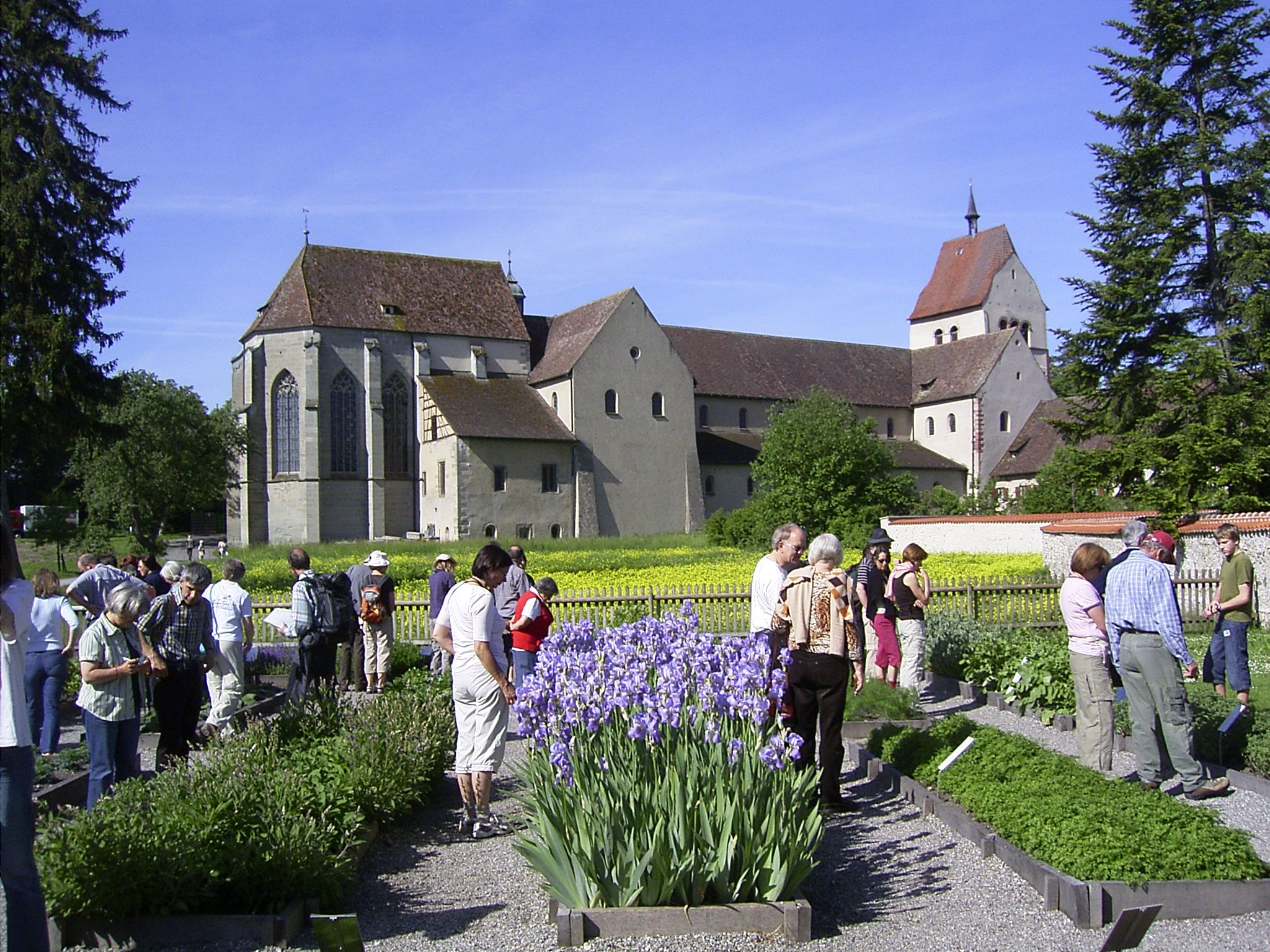 Am nächsten Morgen fuhr der Reisebus über einen Straßendamm auf die berühmte Insel Reichenau, die wie ein langgezogener Tropfen im Untersee liegt. Dieses ungewöhnlich fruchtbare, klimatisch verwöhnte Fleckchen Erde blickt auf eine über 1300 Jahre lange Siedlungsgeschichte zurück und enthält einige herausragende Stätten christlicher Kunst. Die Exkursionsteilnehmer besichtigten vor allem das Münster St. Maria und St. Markus, eine Gründung des Abtes und Wanderbischofs Pirmin, der im achten Jahrhundert auf der Reichenau lebte. Es war einst einer der kulturellen Mittelpunkte des Abendlandes. Um 1000 erreichte hier die Buchmalerei spektakulären Glanz. Um die Kirche herum wachsen einige althergebrachte Kulturpflanzen, wie etwa der Lein. Ein weiteres Kleinod ist der schon seit dem neunten Jahrhundert bestehende Klosterkräutergarten, in dem man ausgiebig schauen, riechen, reiben und schmecken konnte.