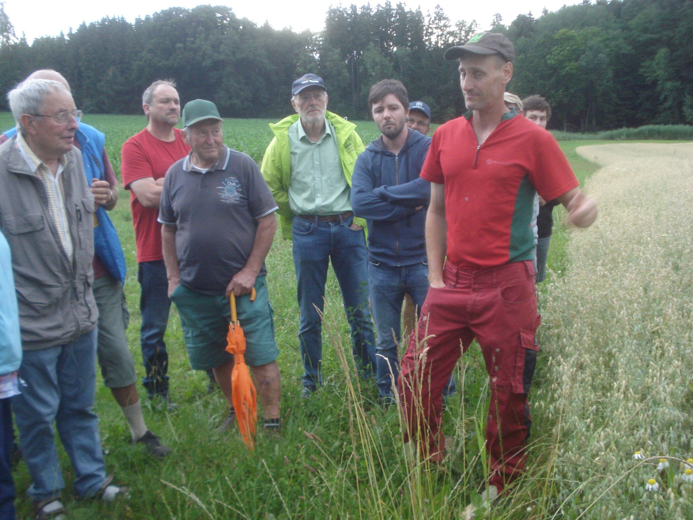 Eingangs stellte Lackermeier seinen Betrieb vor. Er bewirtschafte einen Gemischtbetrieb mit etwa 20 Hektar landwirtschaftlicher Nutzfläche mit Ackerbau, Grünland, Ochsen- und Schweinemast mit Direktvermarktung. Bereits 1986 habe er umgestellt und sei damals einer der ersten Biobauern im Landkreis gewesen. Der Nachbarbetrieb von Josef Priller mit etwa 35 Hektar Ackerland und noch etwas Grünland wird seit sechs Jahren ökologisch bewirtschaftet. Sein Zweitbetrieb in den neuen Bundesländern werde ebenfalls ökologisch bearbeitet. Emil Forster bewirtschaftet zusammen mit seinen Söhnen Emil und Felix in Oberfroschham etwa 35 Hektar (überwiegend Ackerbau) seit 12 Jahren ökologisch. Angebaut werden Kleegras, Winterweizen, Winterroggen und Ackerbohnen. Beide Betriebe sind Mitglied beim Anbauverband Naturland, informierte Lackermeier.