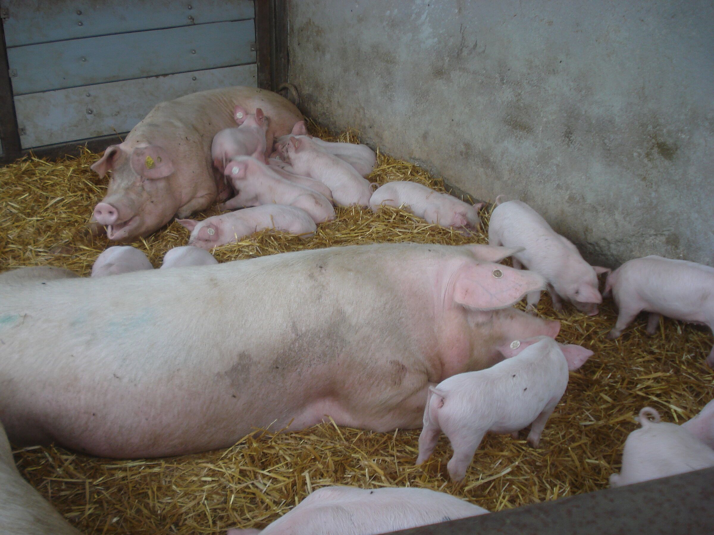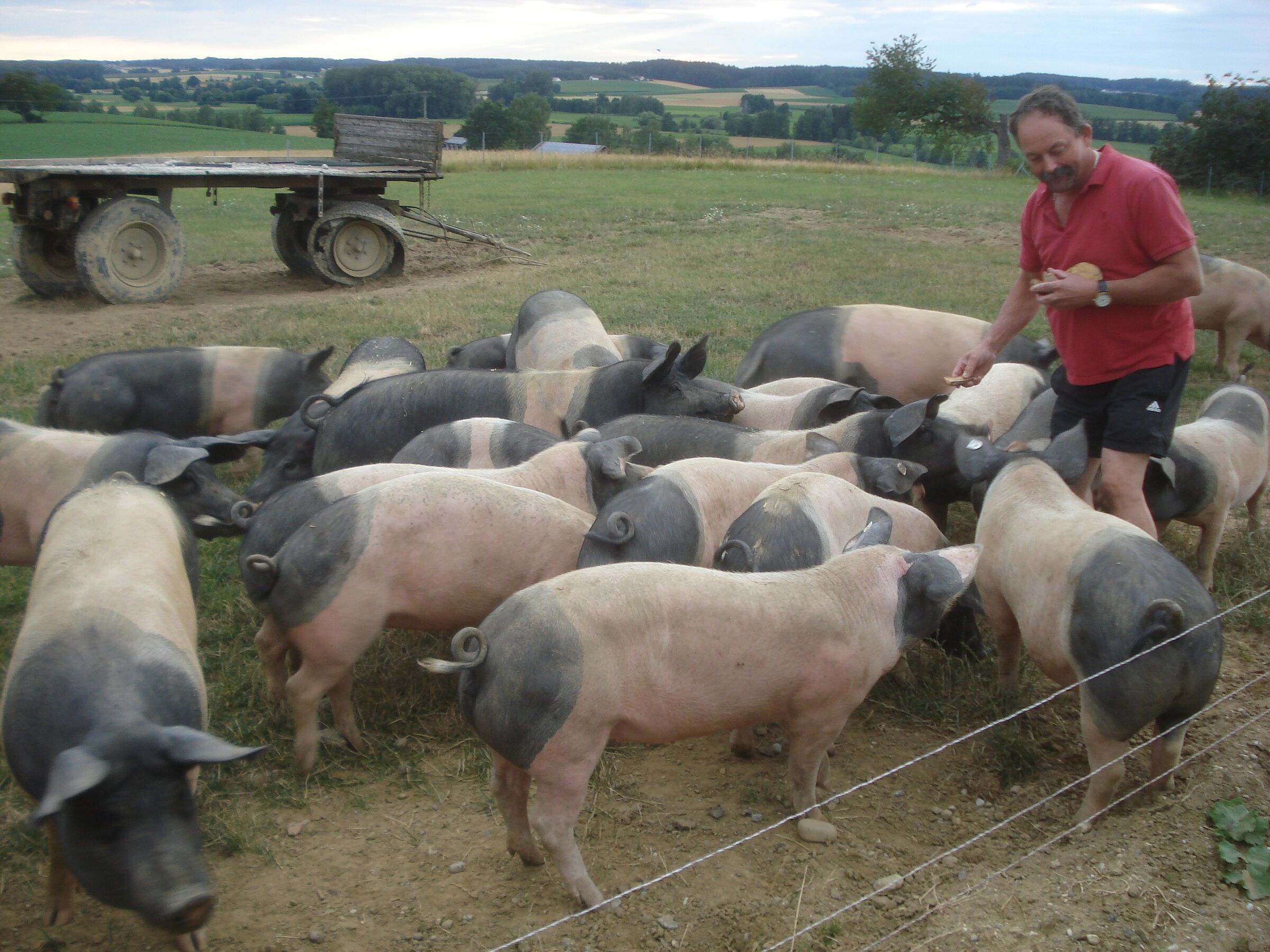 Ein besonderer Blickfang für die Besucher war die Schweinehaltung auf Freiland. Gehalten würden Schwäbisch Hällische Mutterschweine, die von einem Pietrain-Eber gedeckt würden. Dies ergebe eine hervorragende Fleischqualität, was ein anwesendes Münchner Metzgerehepaar bestätigte. Sie verarbeiten und vermarkten regelmäßig Schweine von den Meiers. Es sei im Moment aber nicht ganz einfach, dieses höherpreisige Erzeugnis am Markt durchzusetzen, stellte der Metzgereiinhaber fest. Der Schweinebestand umfasse etwa 60 Tiere (Muttersauen, Masttiere und ein Eber). Geschlachtet, so Meier, würden die Legehennen in Österreich (ein kleiner Teil kommt zur Direktvermarktung zurück), die Mastgockel in einem eigenen Schlachtraum und die Schweine in einem nahegelegenen Schlachtbetrieb.