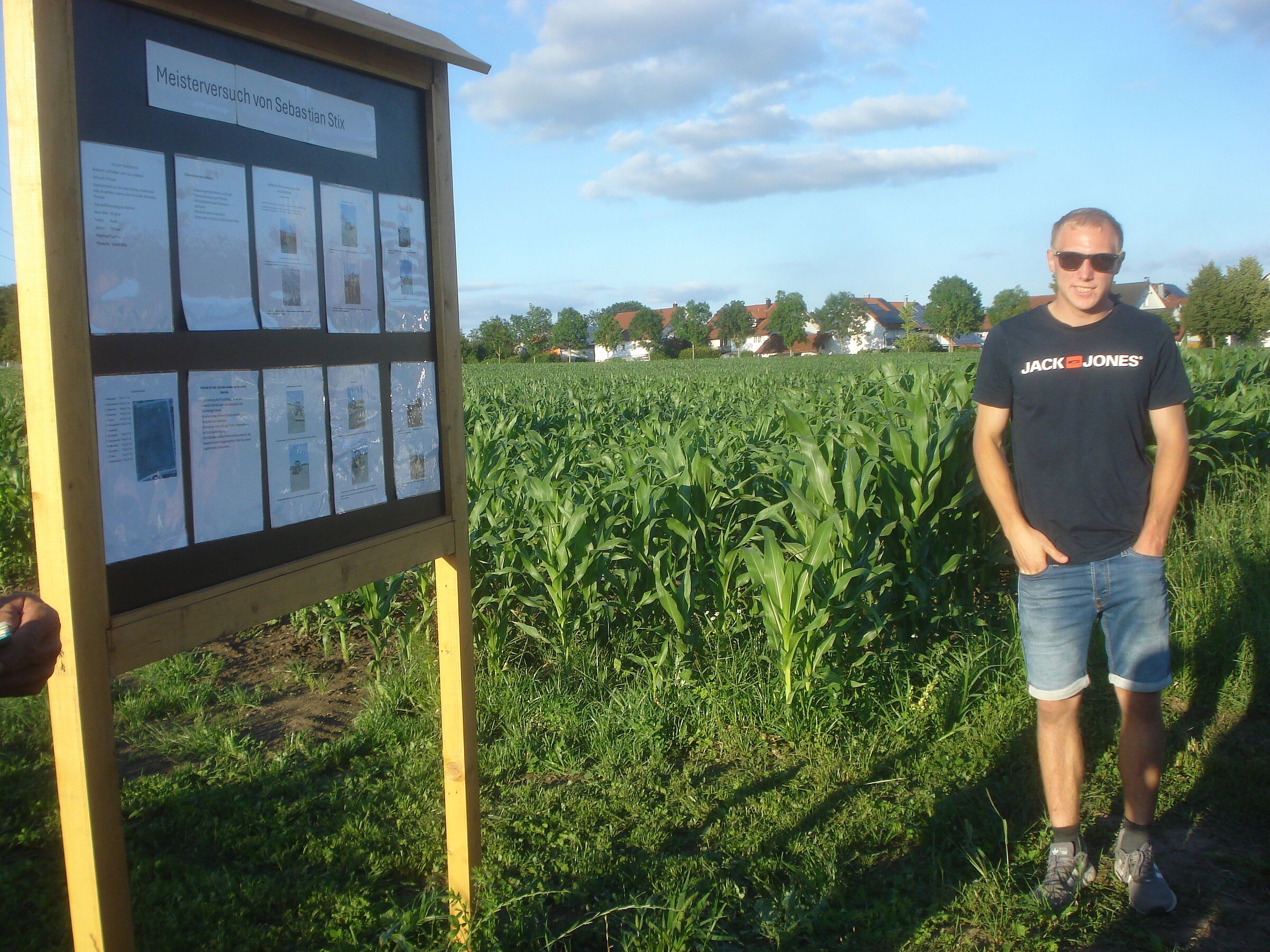 Alexander Watzka kommt aus Pfaffenhofen an der Roth. Seinen Versuch zum Thema „Anbauwürdigkeit von blauen Süßlupinen“ hat er auf einem Bioland-Betrieb in der Nähe von Ulm, auf dem er auch beschäftigt ist, angelegt. Süßlupinen, so Watzka, sorgten für eine gute Durchwurzelung des Bodens, hätten einen guten Phosphoraufschluss und produzierten eine beträchtliche Menge Stickstoff. Sie seien außerdem eine Bereicherung unserer landwirtschaftlichen Kulturlandschaft. Der Meisteranwärter Paul Christl aus Spannerberg bei Parnkofen, hat sein Projekt auf einem Biobetrieb im Raum Dingolfing angelegt, da der elterliche Betrieb noch konventionell bewirtschaftet wird. Er beschäftigte sich mit verschiedenen Mulchsaatvarianten bei Körnermais, wobei er bei einer Variante auch Lehrgeld bezahlen musste.