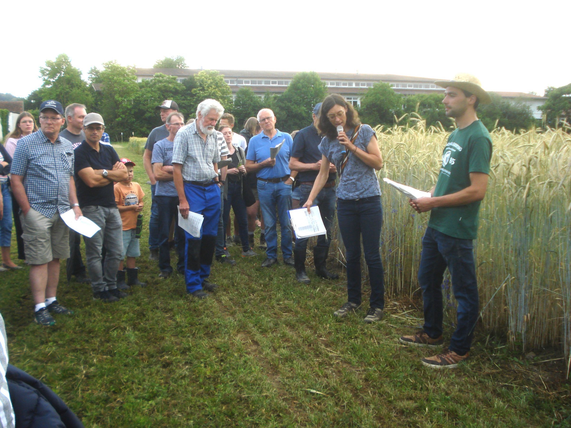 Auf den mageren Teilen des Versuchsfeldes mit geringer Humusauflage seien auch dieses Jahr die alten Getreidesorten Emmer, Einkorn, Hartweizen, Rot- Blau- und Gelbpigment-Weizen zu finden. Die vom Aussterben bedrohten Ackerwildkräuter Kornrade, Frauenspiegel, Steinsame und Ackerrittersporn sind ein Blickfang und tragen zur Artenvielfalt auf dem Versuchsfeld bei. Zum Abschluss bewirteten die Studierenden die Besucher und es gab reichlich Gelegenheit zum Erfahrungsaustauch.