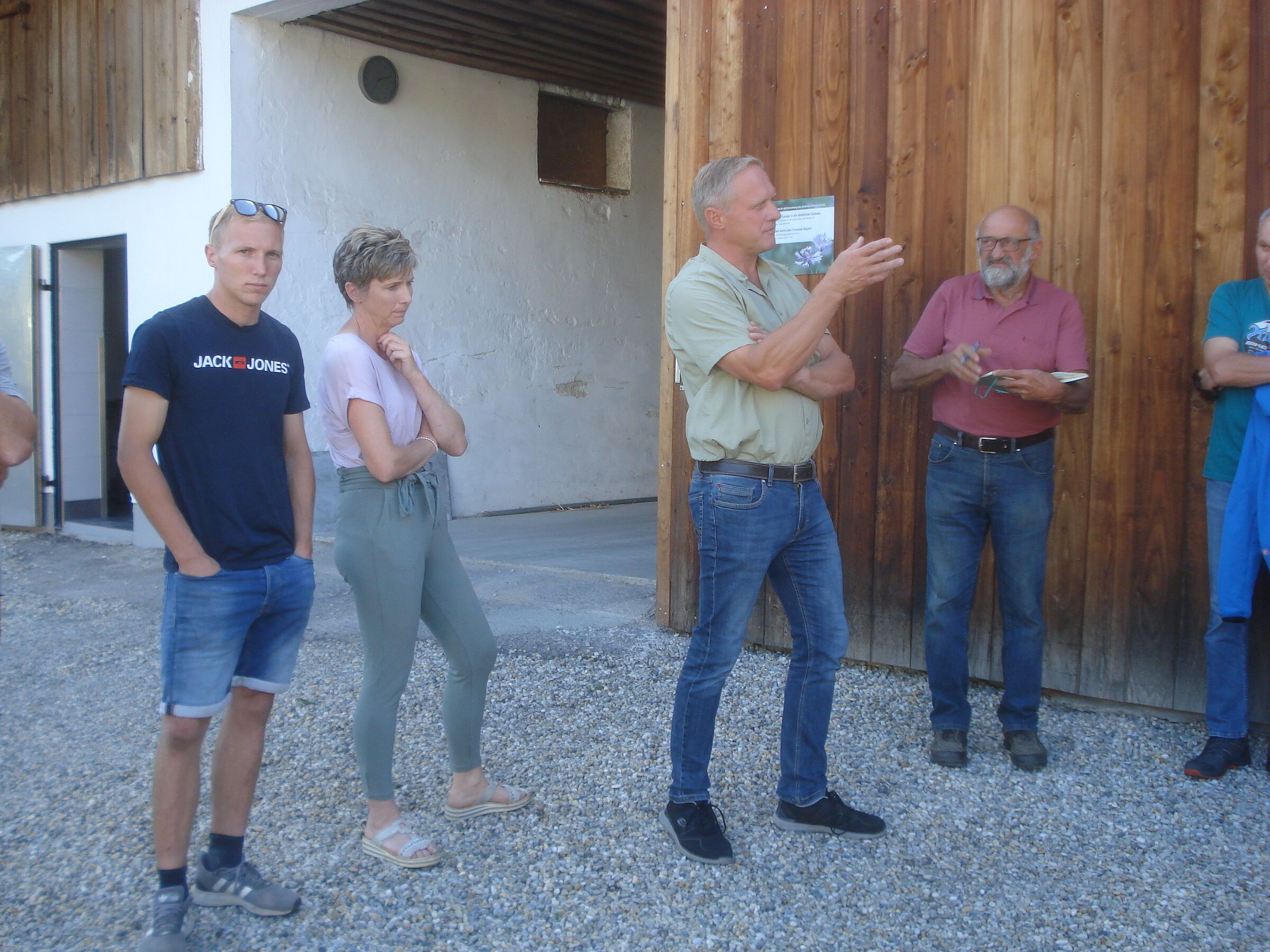 Das Dauergrünland befinde sich zum Teil in unmittelbarer Hofnähe. Dieses werde wegen der starken Hangneigung als Streuobstwiese und Viehweide genutzt, erläuterte Sepp Hanglberger. Der Großteil des Grünlandes befinde sich im Isartal, im Wattenbacher Moos. Gemäht werde bei den Hanglbergers mit einem Doppelmesser-Frontmähwerk. Diese Technik sei im Gegensatz zu den heute hauptsächlich eingesetzten Trommel- und Kreiselmähwerken deutlich insektenschonender und verringert durch die Bauart den Energieeinsatz beim Mähen deutlich. An Tieren, fuhren die Betriebsleiter fort, würden etwa 100 Rinder, davon 80 Mastochsen, gehalten. Neben dem geräumigen Stall könnten sich die Rinder ganztägig auf den Weideflächen aufhalten.