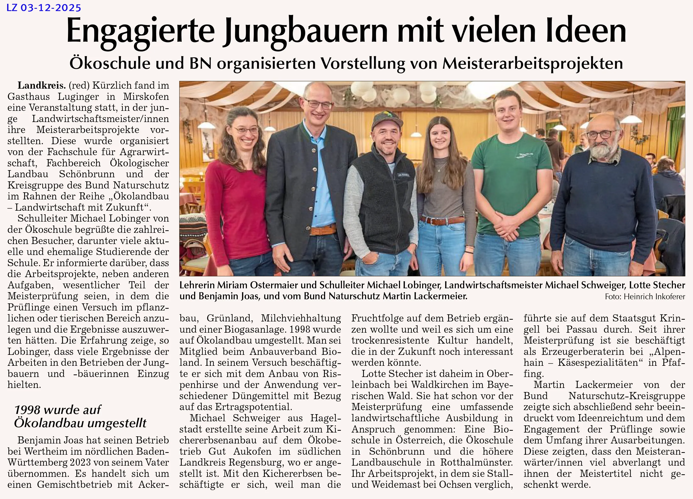 10.11.2025 Kürzlich fand im Gasthaus Luginger in Mirskofen eine Veranstaltung statt, in der junge Landwirtschaftsmeister/innen ihre Meisterarbeitsprojekte vorstellten. Diese wurde organisiert von der Fachschule für Agrarwirtschaft, Fachbereich Ökologischer Landbau Schönbrunn und der Kreisgruppe des BUND Naturschutz im Rahnen der Reihe „Ökolandbau - Landwirtschaft mit Zukunft“.