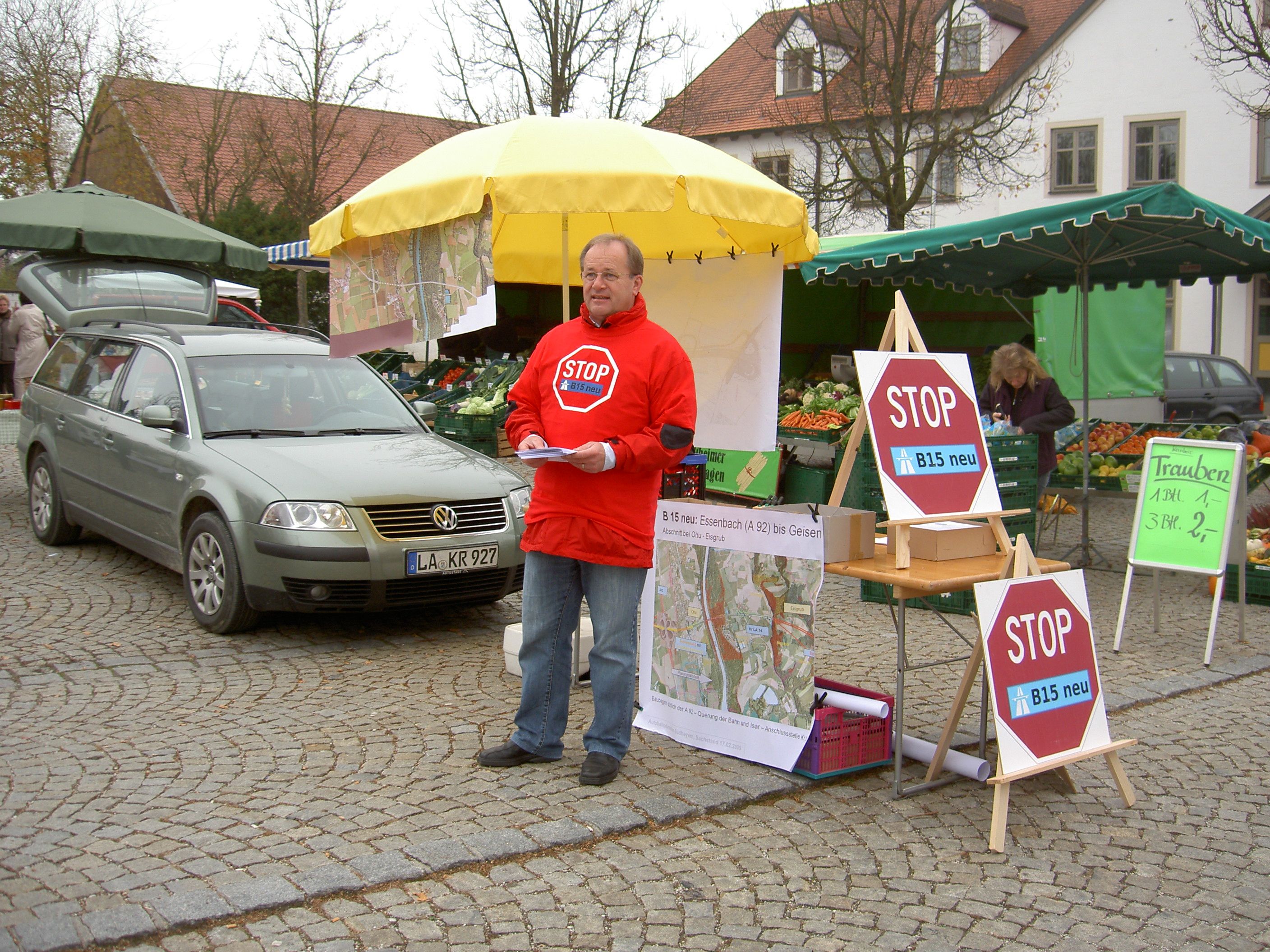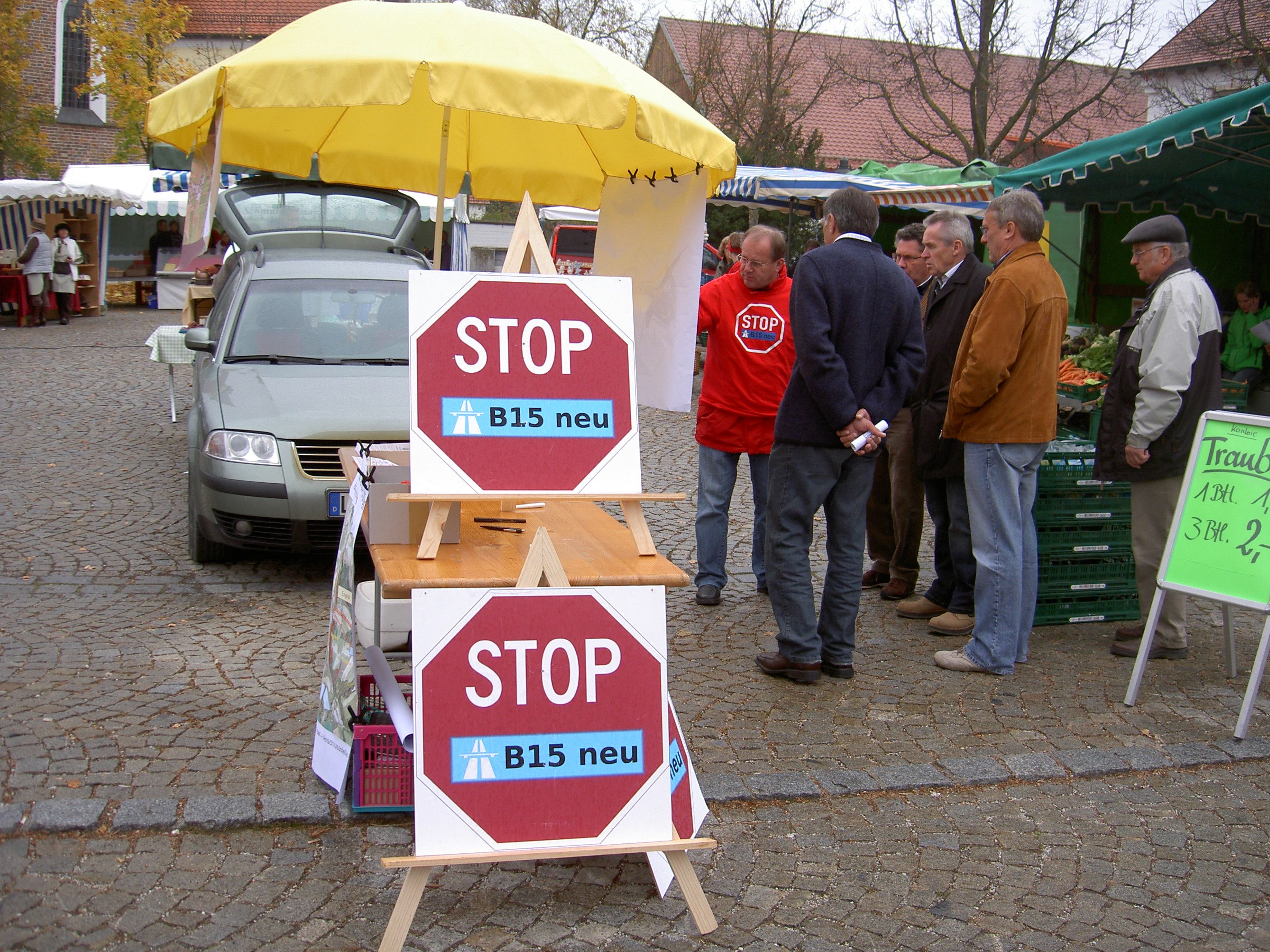 Die Bürgerinitiative B15neu Essenbach/Ohu-Ahrain veranstaltete, zusammen mit dem Bund Naturschutz, am 16. Oktober 2010 einen Infostand zum STOP B15neu am Wochenmarkt in Essenbach (Rathausplatz).