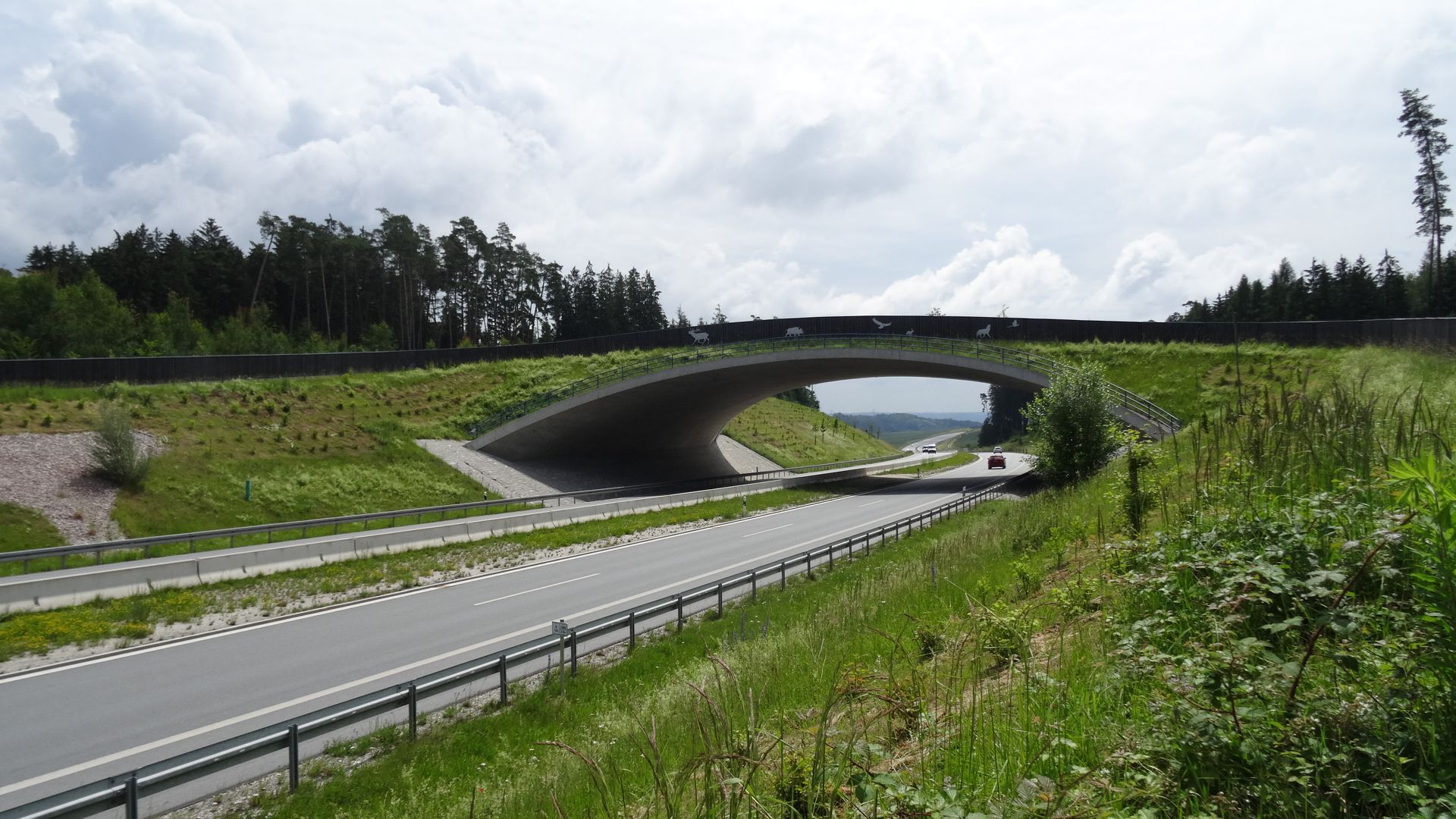 Die Grünbrücke ist naturnah gestaltet: Die Holzverkleidung zeigt die Silhouetten der Wildtiere, für die diese Querungshilfe gedacht ist, und lenkt so die Aufmerksamkeit auf die ökologische Funktion. Auch für den Menschen hat die Grünbrücke einen praktischen Nutzen, denn sie reduziert beispielsweise die Zahl der Wildunfälle.