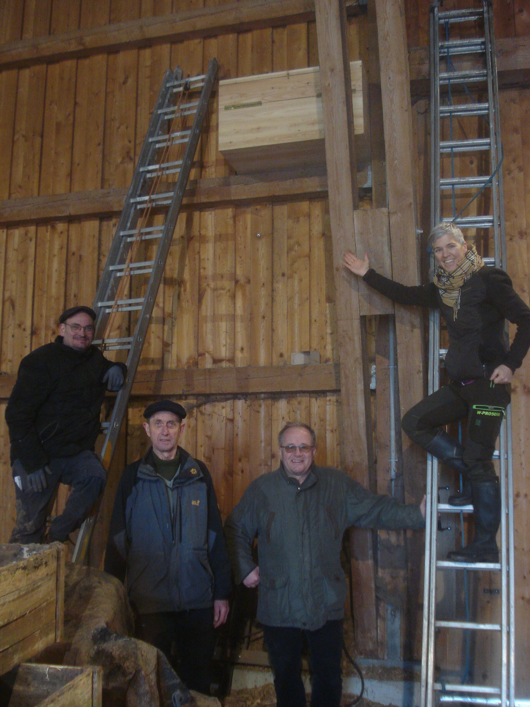 Essenbach, 4. Februar 2023. Gemeinsam mit Mitgliedern der OG Vilsbiburg hat die OG Essenbach in Duniwang auf Bitten der Besitzer eines Stadels einen Schleierkasten angebracht. Nachdem diese an verschiedenen Stellen entlang des Stadels Gewölle gefunden hatten, baten sie den Bund Naturschutz um Hilfe und um einen Nistkasten für Schleiereulen, den die Ortsgruppe Vilsbiburg organisierte. Nun sind alle Beteiligten gespannt, ob der Kasten angenommen wird und ob es zu einer erfolgreichen Brut kommen wird. Geduld ist im Artenschutz immer gefragt und auch wenn sich der Nachwuchs erst im kommenden Jahr oder später einstellt, hat sich der Aufwand gelohnt.