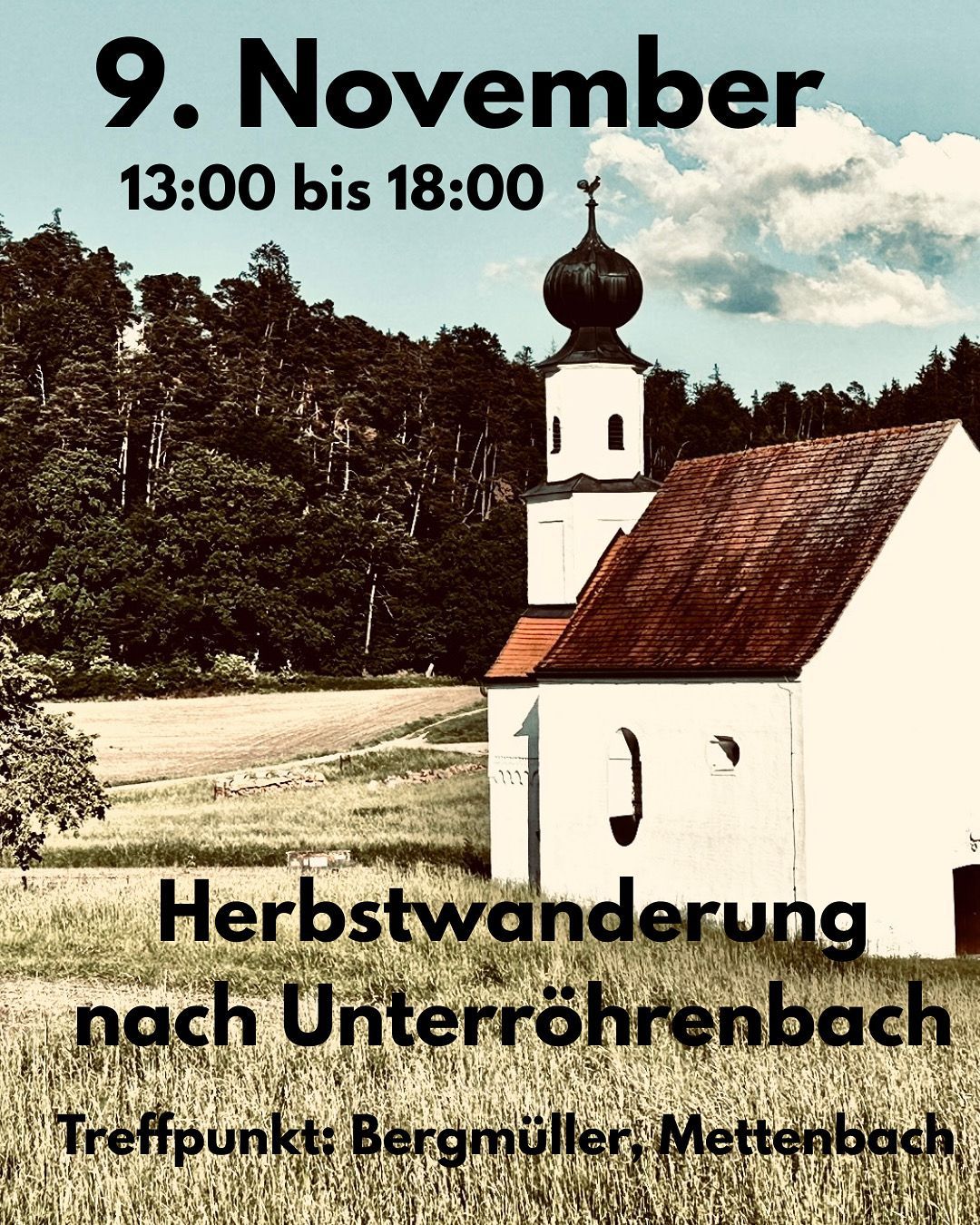 Am 9. November um 13:00 Uhr steht unsere Herbstwanderung an. Start und Endpunkt ist das Gasthaus Bergmüller in Mettenbach. Von dort wandern wir durch das Tertiärhügelland nach Unterröhrenbach und besichtigen auf dem Weg die Kirche St. Ulrich und St. Martin (13. Jahrh.). Wir laufen mit Anton Moissl etwa 8 km durch einen schönen Mischwald und zurück.Wer mag, hat anschließend die Möglichkeit, beim Bergmüller einen Einkehrschwung mit Brotzeit zu machen. Anton, Fritz, Tjards und die anderen BNler beantworten gerne aufkommende Fragen.