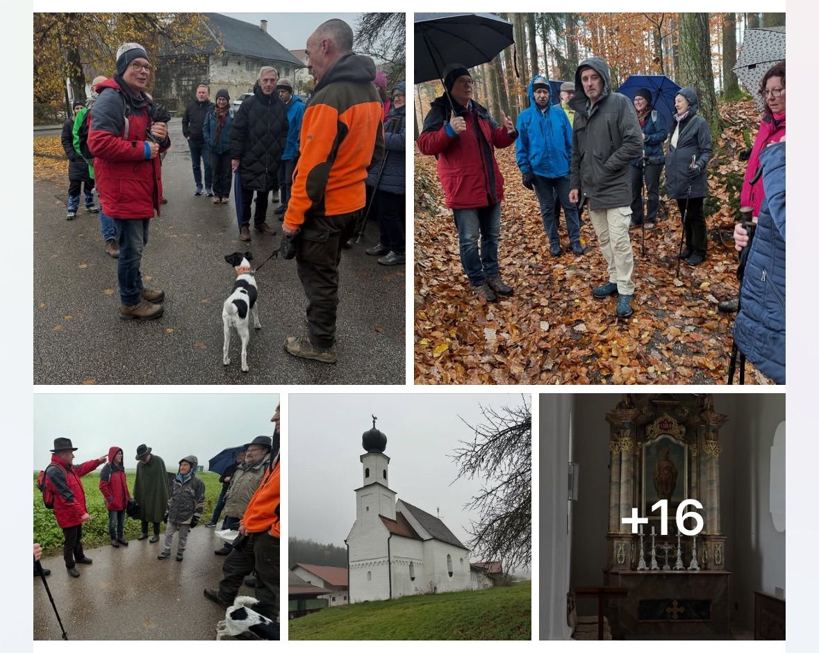 Mettenbach, 09. November 2025: Für Naturfreundinnen und -freunde gibt es bekanntlich kein schlechtes Wetter, sondern nur die falsche Kleidung: Zum BN-Spaziergang von Mettenbach zur Kirche “St. Ulrich und St. Martin” (13. Jh.) in Unterröhrenbach kamen fast 30 Unentwegte. Auf dem Weg durch den Mischwald hatte Anton Moissl zahlreiche Stopps eingebaut, an denen es Interessantes über die Natur und die Kultur im Markt zu erzählen gab. So haben wir einen neuen Ameisenhaufen entdeckt, eine riesige Rotbuche kartiert und zahlreiche Pilze gesehen. Dabei waren auch eine ganze Reihe Gäste aus den Nachbargemeinden, etwa von der Ortsgruppe aus dem angrenzenden Ergoldsbach. Der Erfahrungsaustausch war lebendig und das feuchte Novemberwetter hat niemanden so richtig gestört. Zum Abschluss beim zünftigen Einkehrschwung beim Flori vom Gasthaus Bergmüller in Mettenbach war allen wieder warm.