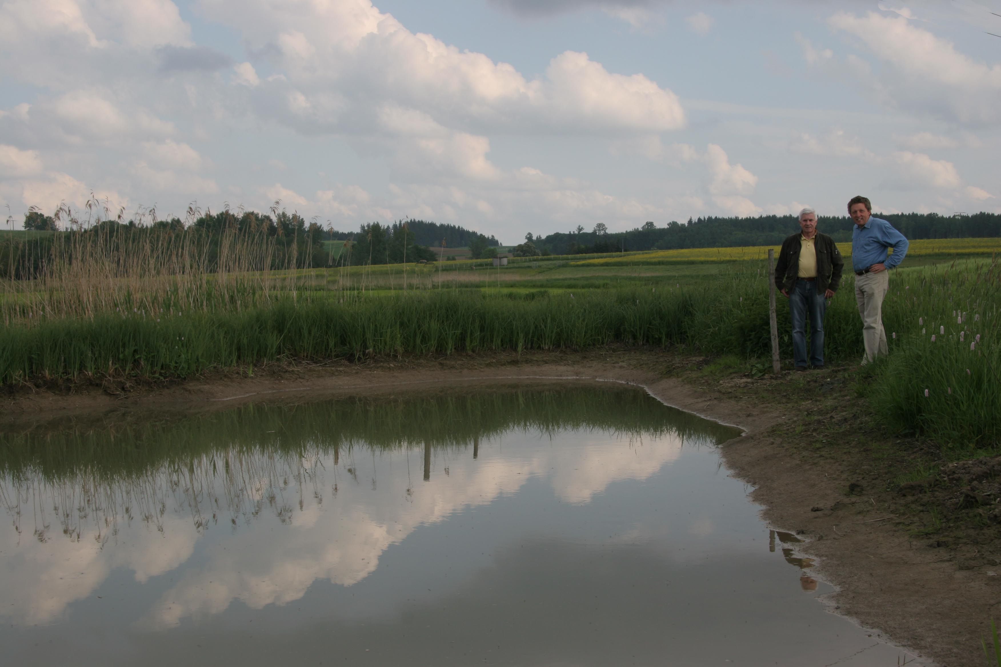 Es gibt zu wenig Laichgewässer im Vilstal. Um diese Situation zu verbessern hat Paul Kainz der Bund Naturschutz Ortsgruppe „Kleines Vilstal“ ein geeignetes Grundstück unweit der Kleinen Vils zur Verfügung gestellt. Angrenzend an der alten Vils wurden zwei Kopfweiden gesetzt. Auf der Fläche haben sich ein Schilfbestand und Seggen entwickelt. Zwischenzeitlich hat sich die Fläche zu einem wichtigen Lebensraum für eine vielfältige Tierwelt entwickelt. An der westlichen Randzone wurde nun ein Teich mit verschiedenen Tiefenzonen und flach ausgebildeten Randzonen angelegt. Damit die Teichfläche nicht beschattet wird, wurden nur wenige Sträucher wie Faulbaum, Pfaffenhütchen und Traubenkirsche eingesetzt. „Es ist erstaunlich wie schnell dieser neue Lebensraum angenommen wird“ stellte Johannes Selmansberger bei einem Ortstermin mit Paul Kainz fest. Im Schilfbestand hat sich die Rohrammer niedergelassen. Die Zaunpfosten nutzen Eulen als Sitzwarten und die Rehe benutzen den Teich als Tränke. Die ersten Schwimmkäfer und Libellen sind auch schon aufgetaucht. Das neue Biotop in unmittelbarer Umgebung zum Ziegelberg ist eine deutliche Aufwertung für den ganzen Bereich. Der Vorsitzende bedankte sich recht herzlich bei Paul Kainz, der mit der Neuanlage sichtlich zufrieden war. Aus der Sicht des Naturschutzes ist dies ein Glücksfall, denn es ist nicht selbstverständlich, dass Leute, die nicht einmal im Gemeindegebiet wohnen uneigennützig Flächen für die Natur zur Verfügung stellen.