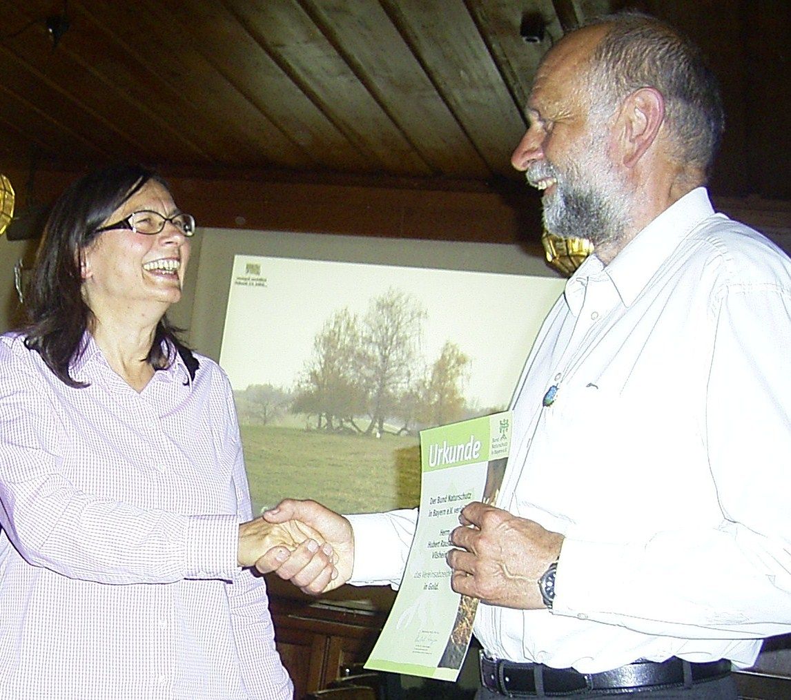 Vilsheim. Hubert Rauscher aus Schweiberg bei Vilsheim wurde für seine Verdienste um den Bund Naturschutz (BN) mit der Vereinsnadel in Gold und Urkunde geehrt. Seit 20 Jahren bekleidet der engagierte Naturschützer das verantwortliche Ehrenamt des Schatzmeisters der BN-Kreisgruppe Landshut. Im Namen des BN-Landesvorstandes nahm Kreisgruppenvorsitzende Kathy Mühlebach-Sturm die Ehrung vor und übermittelte auch die Dankesworte der Kreisgruppe.