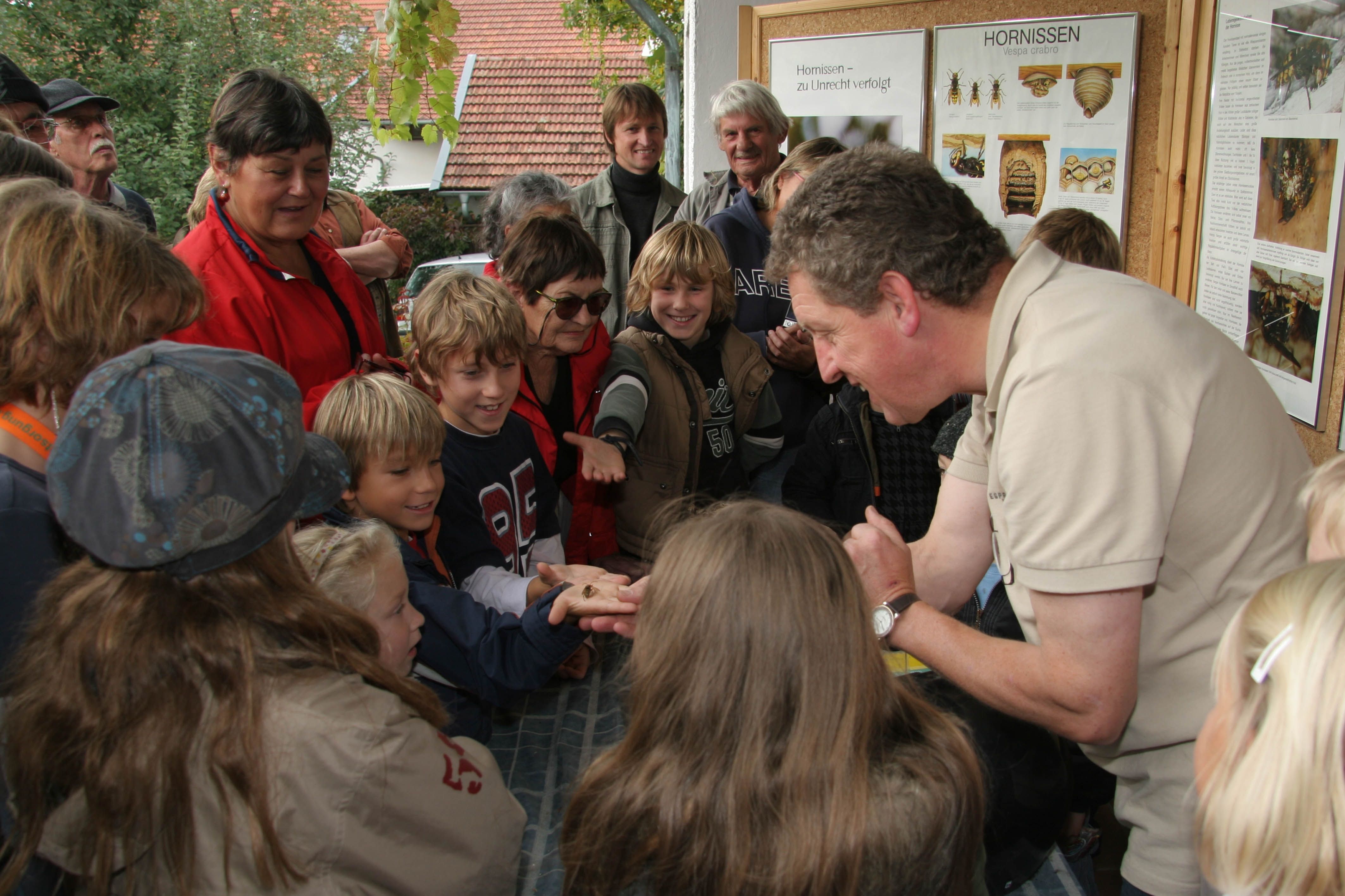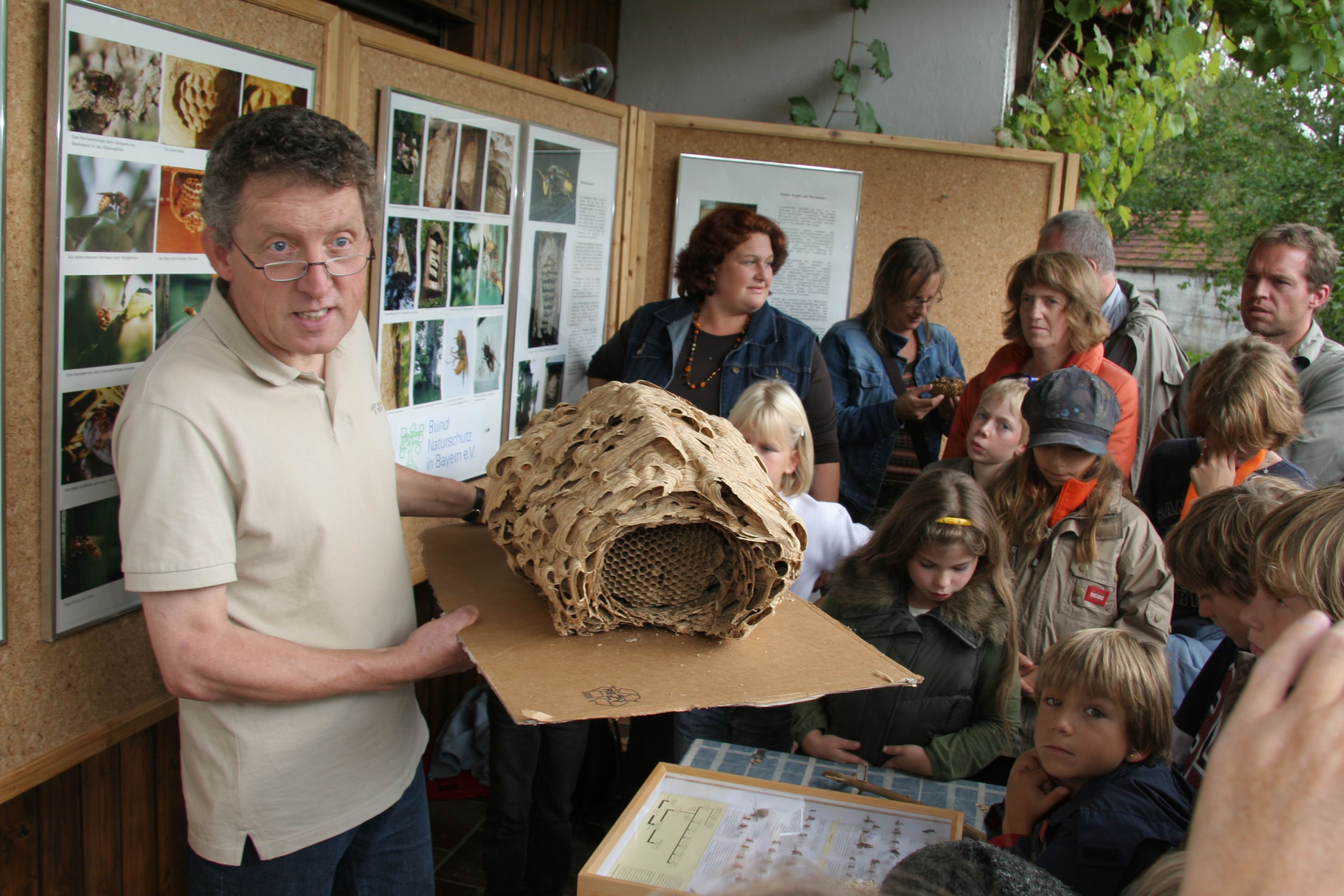 Die naturkundlichen Exkursion mit dem Titel „Hornissen - wie und wo leben sie?“, die von der Bund-Naturschutz-Kreisgruppe Landshut und der BN-Ortsgruppe „Kleines Vilstal“ in Vilsheim veranstaltet wurde, fand im Kindergarten in Vilsheim statt. Johannes Selmansberger, Hornissenspezialist und Ortsgruppenvorsitzender, stellte die Lebensweise und die Biologie dieser Großinsekten vor.Dazu hatte er nicht nur eine informative Ausstellung mit Fotos und zahlreiche Objekte aufgebaut, sondern konnte sogar ein aktives Hornissennest zur Schau stellen.