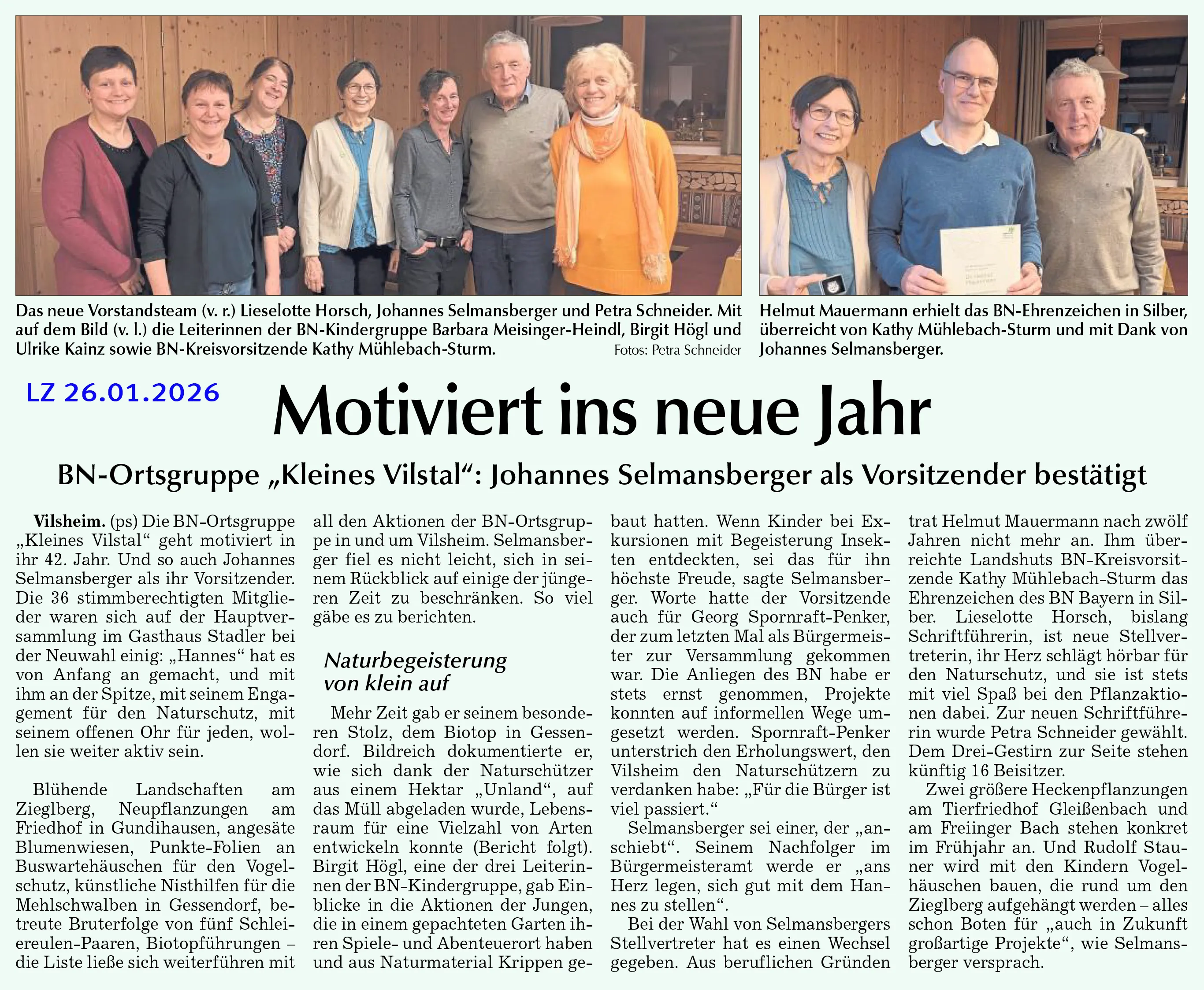 Vilsheim. Bei der diesjährigen Jahresmitgliederversammlung der Bund-Naturschutz-Ortsgruppe „Kleines Vilstal“ konnte Vorsitzender Johannes Selmansberger im Gasthaus Stadler wieder auf zahlreiche Aktivitäten der Ortsgruppe zurückblicken. Zu Beginn des Jahres standen Neuwahlen an, bei denen der Vorstand erheblich ausgeweitet wurde. Biotopgestaltungen und Biotoppflege sowie naturkundliche Wanderungen und Vorträge waren die Schwerpunkte in der Naturschutzarbeit.