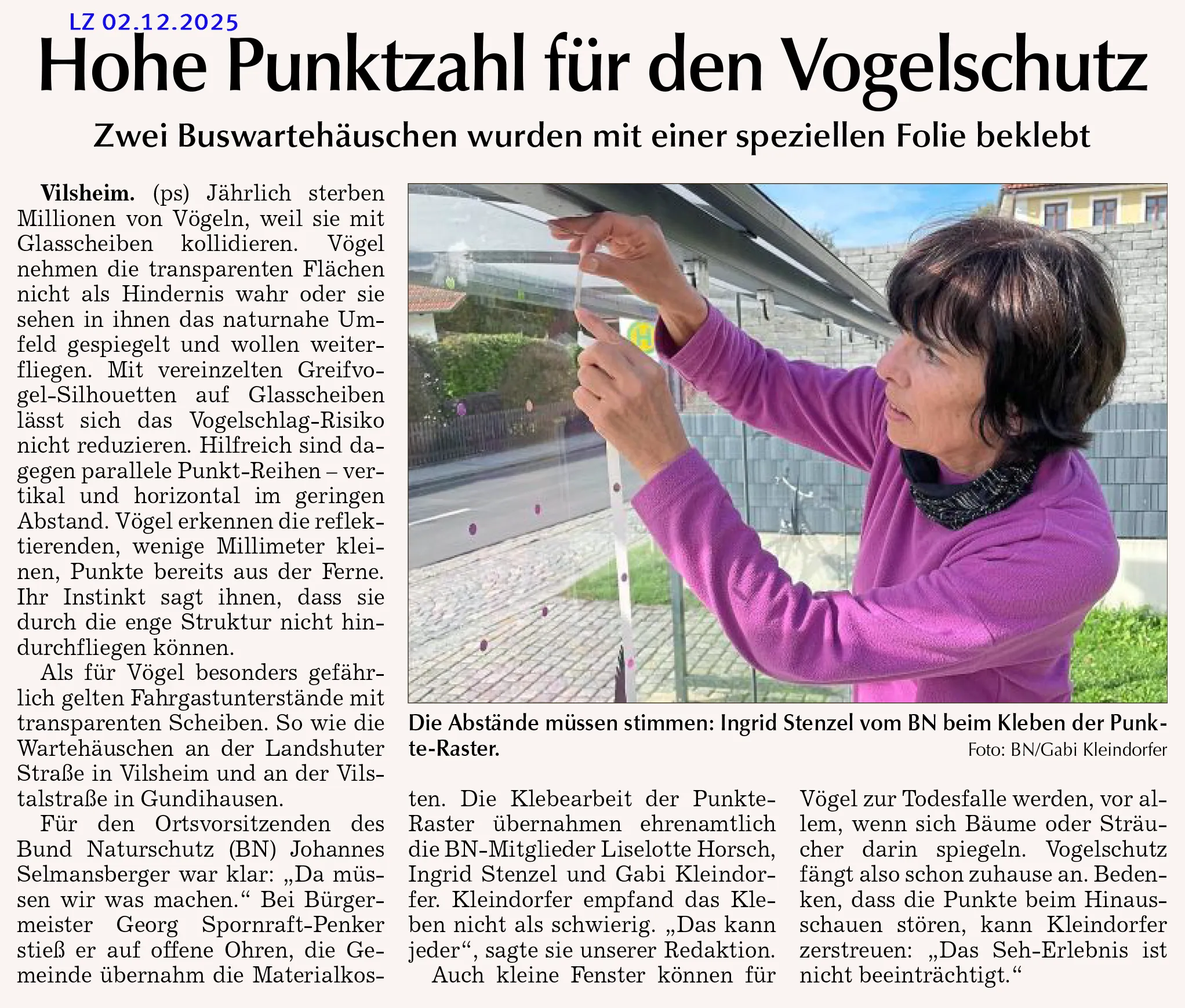 Die Aktion der Ortsgruppe „Kleines Vilstal“ dient als positives Beispiel, das zur Nachahmung anregen kann. Die Gemeinde hat die Kosten für das notwendige Material übernommen, während Mitglieder der Ortsgruppe die Beklebung der Glasflächen übernommen haben. Im kommenden Frühjahr werden sich die Vögel mit vielstimmigem Gezwitscher für diese Maßnahme bedanken.