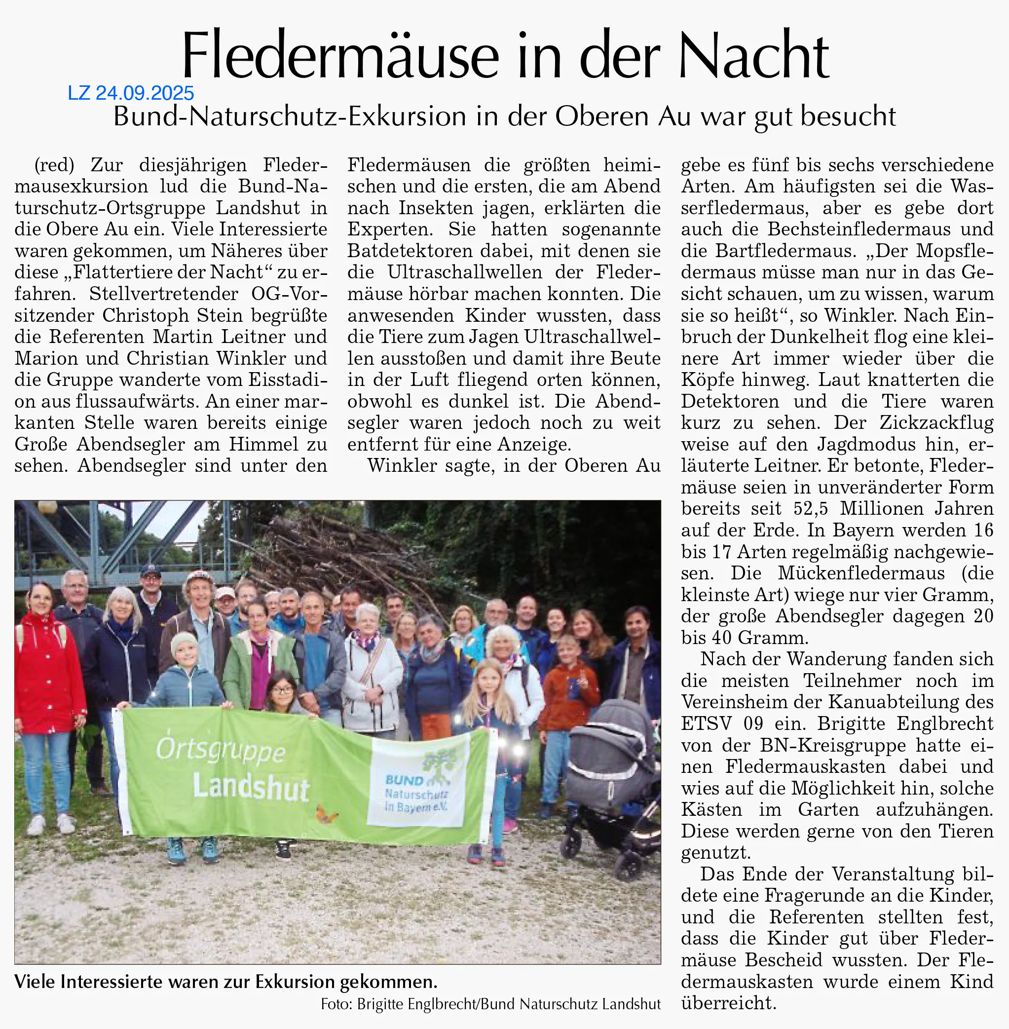 Zur diesjährigen Fledermausexkursion lud die BUND-Naturschutz-Ortsgruppe Landshut für den 12. September 2025 in die Obere Au ein. Viele Interessierte waren gekommen, um Näheres über diese „Flattertiere der Nacht“ zu erfahren. Stellvertretender OG-Vorsitzender Christoph Stein begrüßte die Referenten Martin Leitner und Marion und Christian Winkler zu Beginn freundlich und die Gruppe wanderte vom Eisstadion aus flussaufwärts. An einer markanten Stelle waren bereits einige Große Abendsegler am Himmel zu sehen. Abendsegler sind unter den Fledermäusen die größten heimischen, und die ersten, die am Abend nach Insekten jagen, erklärten die Experten. Sie hatten sogenannte Batdetektoren dabei, mit denen sie die Ultraschallwellen der Fledermäuse hörbar machen konnten. Die anwesenden Kinder wussten, dass die Tiere zum Jagen Ultraschallwellen ausstoßen und damit ihre Beute in der Luft fliegend orten können, obwohl es dunkel ist. Die Abendsegler waren jedoch noch zu weit entfernt für eine Anzeige. Die Ultraschallwellen der meisten Fledermäuse liegen in einem Bereich von 20 bis 140 kHz. Diese Frequenzen sind für die Menschen nicht hörbar. Kinder haben jedoch ein deutlich besseres Gehör im höheren Frequenzbereich und können die tieferen Töne der Fledermäuse hören, teilten die Referenten mit. Christian Winkler informierte, dass es in der Oberen Au fünf bis sechs verschiedene Arten gebe. Am häufigsten sei die Wasserfledermaus, aber es gebe hier auch die Bechsteinfledermaus und die Bartfledermaus. „Der Mopsfledermaus müsse man nur in das Gesicht schauen, um zu wissen, warum sie so heißt“, erzählte Winkler. Nach weiterer kurzer Wanderung und einbrechender Dunkelheit flog eine kleinere Art immer wieder über die Köpfe der Kinder und Erwachsenen hinweg. Laut knatterten die Detektoren und die Tiere waren kurz zu sehen. Der Zikzakflug weist auf den Jagdmodus hin, erläuterte Leitner. Er betonte, Fledermäuse seien in unveränderter Form bereits seit 52,5 Millionen Jahren auf der Erde. In Bayern werden 16 bis 17 Arten regelmäßig nachgewiesen. Die Mückenfledermaus (kleinste Art) wiege nur vier Gramm, der große Abendsegler dagegen 20 bis 40 Gramm.