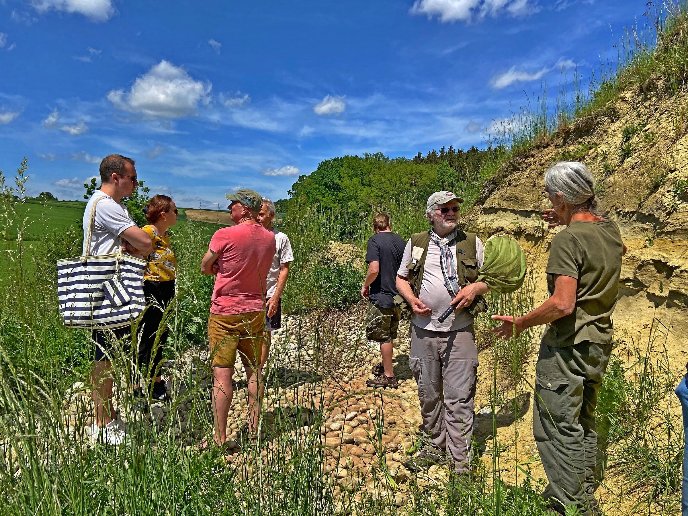Erwin Scheuchl hatte sich mit seinem Fangnetz direkt vor der Steilwand positioniert, wo er immer wieder ein Wildbienenexemplar einfing, in ein Gläschen einschloss und dieses unter den Teilnehmern zirkulieren ließ, während er seine Erläuterungen dazu gab. So konnten die Exkursionsteilnehmer verschiedene Arten der Gattung Andrena (Sandbienen) direkt betrachten und somit näher kennenlernen, ebenso wie einige Schmal- und Furchenbienen (erkennbar an der Furche auf dem letzten Hinterleibssegment) der Gattungen Lasioglossum und Halictus.
