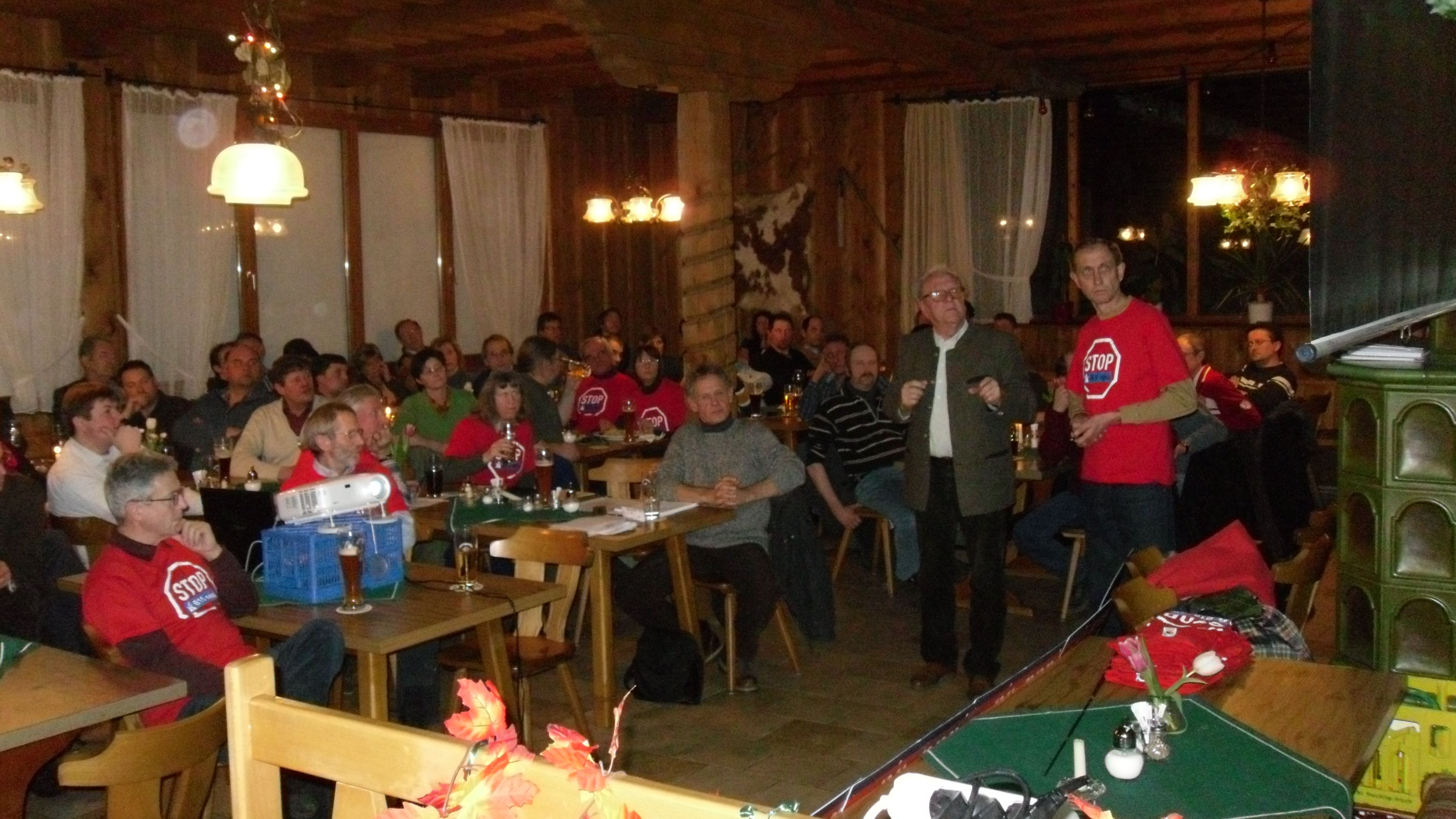 In seiner Begrüßung hob Hans Winter, Vorsitzender der Ortsgruppe Oberes Binatal/Rottquelle die Anwesenheit aller Bürgermeister der Gemeinde Wurmsham, Bürgermeisterin Maria Neudecker und ihre Stellvertreter Jakob Limmer und Siegfried Müller hervor. Neben der Gemeinderäten Mathias Kirmeier und Peter Kraxenberger war mit Rosi Steinberger auch eine Kreisrätin anwesend. Anschließend warf der stellvertretende Kreisgruppenvorsitzende des Bund Naturschutz, Paul Riederer einen Blick auf die Anfänge dieses Straßenbauvorhabens, das ursprünglich als Autobahn A93 firmierte. Da das Kind lediglich in B15 neu umgetauft, die Pläne aber nicht geändert wurden, kann man seiner Meinung nach der Wahrheit entsprechend von einer Autobahn sprechen. Den Verlauf von Saalhaupt nach Rosenheim skizzierte dann Stefan Englbrecht, Vorsitzender der BN-Ortsgruppe Vilsbiburg. Nachdem nun von Regensburg her kommend die ersten Teilstücke gebaut werden und das Erreichen der A92 bei Essenbach wohl feststeht, rückt die Bedrohung für den südlichen Landkreis näher. Die Straße ist aber seiner Information nach in der Region Rosenheim schon länger kein Thema mehr und auch die Politiker sprechen nur noch von einem Bau bis Schwindegg, wo die Fernstraße in die geplante A94 münden soll. Warum also viel Geld in ein fragwürdiges Teilstück stecken und damit Heimat, Ackerflächen und Natur zerstören? In der Folge erläuterte Stefan Englbrecht dann den Stand der Dinge im südlichen Landkreis. Angefangen von der Anschlussproblematik der Straße an Landshut bis hin zu den wegen der finanziellen Mittel zu erwartenden Teillösungen, die die jeweils betreffende Gemeinde im Verkehr ertrinken ließen, ging er auf zahlreiche Aspekte ein. Die Stadt Landshut fordert die B15 neu vehement als Lösung ihrer Verkehrsprobleme. Sieht man sich die Situation dort näher an, wird diese Straße wohl kaum dafür herhalten können, so Englbrecht und Riederer, da der meiste Verkehr hausgemacht ist. Sie belegten dies mit offiziellen Verkehrsmengenzählungen. Dafür würde der zusätzliche Verkehr die Gemeinden Adlkofen, Geisenhausen, Vilsbiburg, Velden, Wurmsham, Buchbach und Schwindegg mit Lärm und Dreck überhäufen. Aber gibt es Alternativen? Durchaus meinte Paul Riederer, denn sinnvolle Ortsumgehungen wie sie der Bund Naturschutz seit Jahrzehnten fordert, tragen sowohl der Erfordernissen des örtlichen wie des überörtlichen Verkehrs Rechnung. Er verwies dazu auf die Umgehung von Vilsbiburg, die so schon lange vor ihrer Umsetzung eine Forderung des Bund Naturschutz war. Eine maß- und sinnvolle Verkehrsentwicklung, wie sie der Ausbau der vorhandenen Verkehrswege im bereits dichtesten Straßennetz Europas darstelle, sei hier das Gebot ergänzte Herbert Jans, Vorsitzender der BN-Ortsgruppe Geisenhausen. Zudem seien bereits die Sanierungen kostspielig genug.