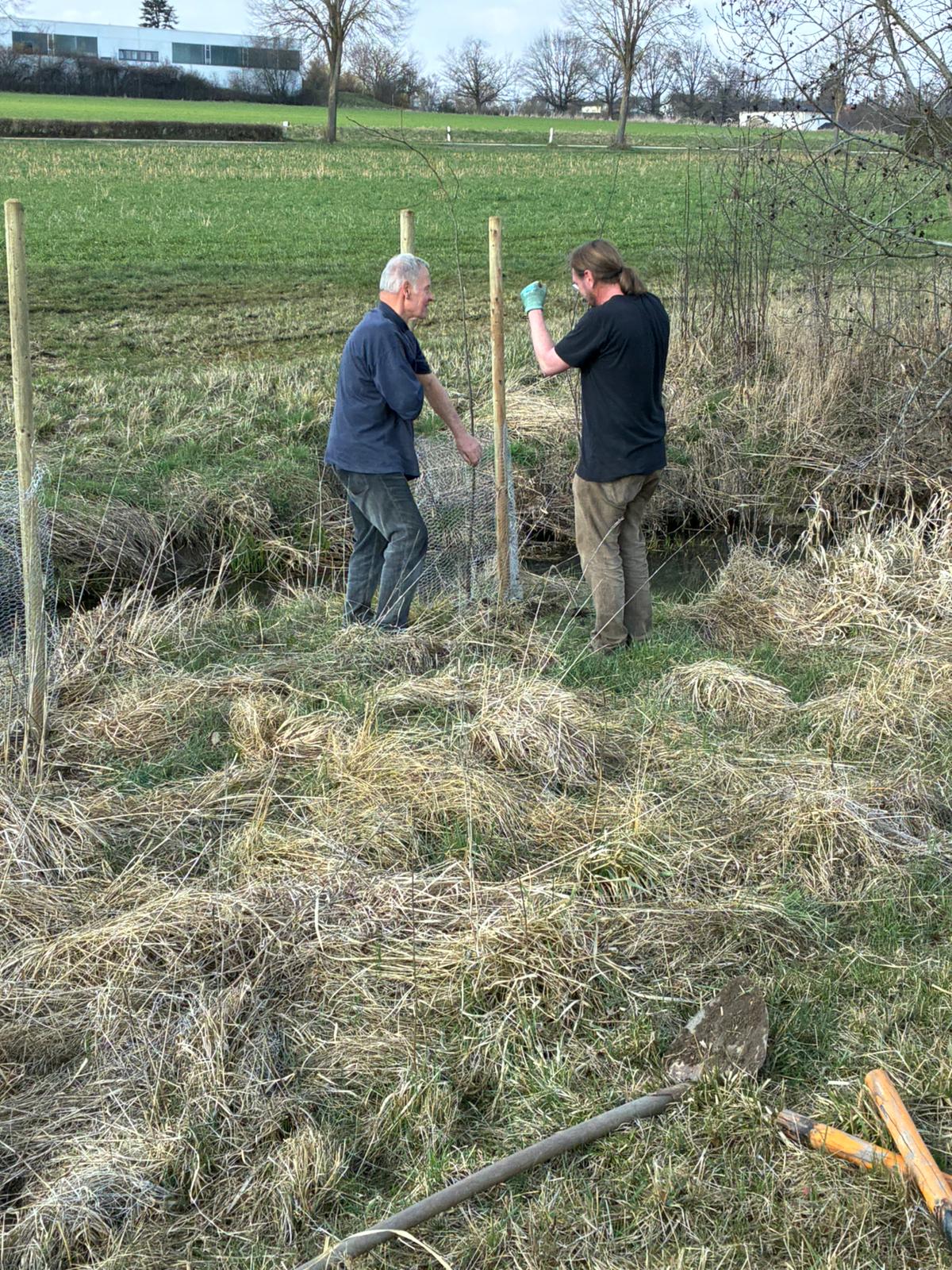 Um die jungen Bäume bestmöglich zu schützen und ihr Anwachsen zu sichern, wurden sie mit Biberschutz versehen – der Biber ist an dieser Stelle sehr aktiv – und jeweils durch zwei Pfähle stabilisiert.
