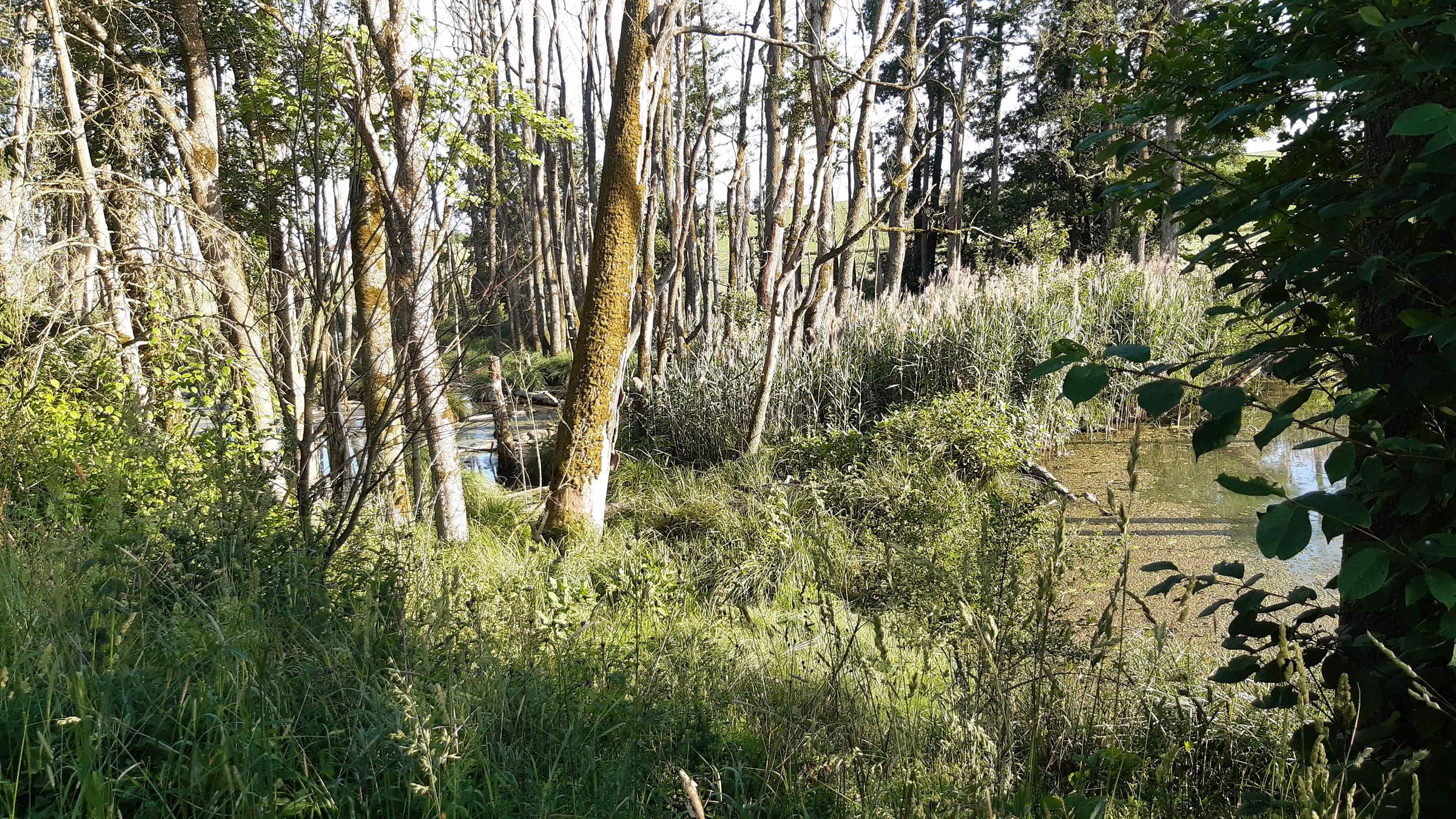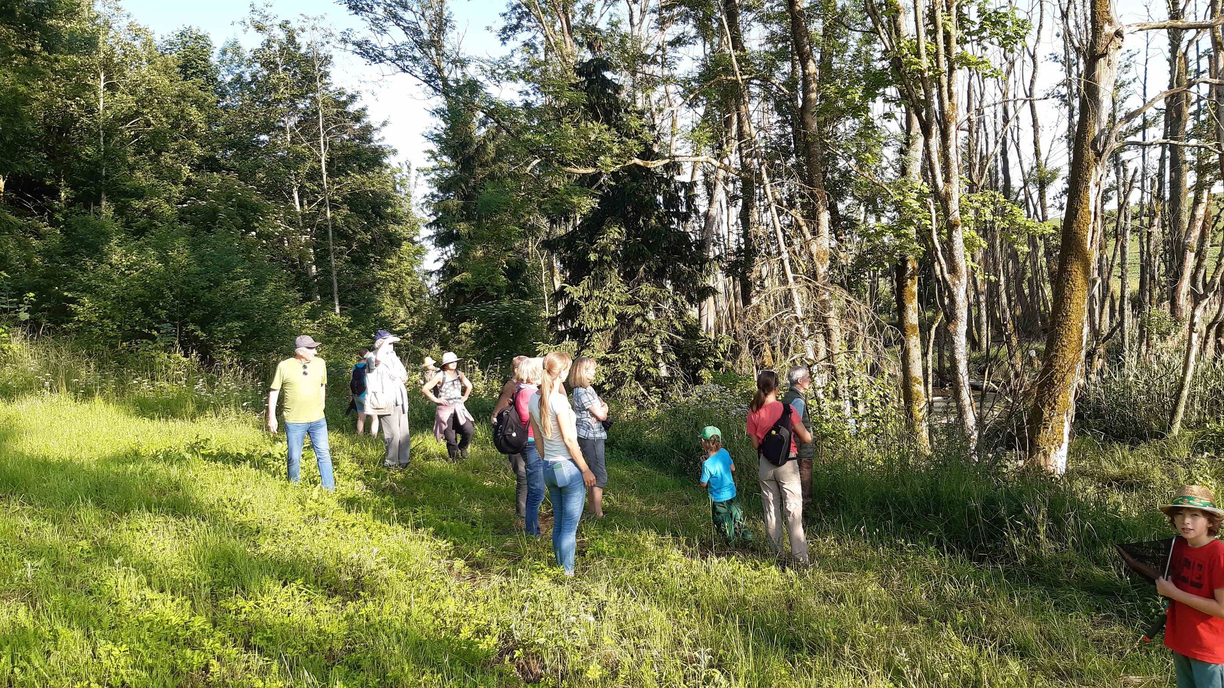 Nach einer Mittagsrast bei Grandl’s Hofcafe in Sandgrub ging es unter der Führung von Lucia Karrer auf einem Wanderweg zu den Toteiskesseln weiter. Frau Karrer hat ihre Diplomarbeit über diese eiszeitlichen Senken geschrieben und ist bis heute begeisterte, kenntnisreiche Schützerin und Bewahrerin der Kessel. Vor Beginn der Führung erklärte sie im Groben wie diese kleinen und großen Täler am Ende der letzten Eiszeit durch große, zurückbleibende Eisbrocken entstanden sind. Diese wurden beim Rückzug der Gletscher unter Schotter und Schwemmsand begraben. Später schmolzen sie langsam ab, unter der Erde entstand ein Hohlraum, der später einbrach und diese Kessel hinterließ. Die Wanderung führte zu verschiedenen dieser Kessel, mal in einem Feld, die meisten aber mitten im Wald. So war auch das warme Wetter ideal für den Weg. Fast jeder Kessel besitzt eine einzigartige Flora und Fauna. 25 Arten von Libellen gibt es hier zu sehen, viele flitzten auch während der Führung gerade über die Wasserflächen. Sehr seltene Gewächse gibt es in diesen kleinen Biotopen wie Fieberklee oder Wollgras. Einige der Kessel wurden in den 60er und 70er Jahren verfüllt um die landwirtschaftliche Bearbeitung einfacher zu machen, viele konnten zum Glück gerettet und teilweise renaturiert werden. Frau Karrer ist es in unermüdlicher Arbeit und Gesprächen mit Landwirten und Grundbesitzern gelungen, das Bewusstsein für den Wert dieser Naturwunder zu wecken – inzwischen sind die Haager stolz auf ihre Toteiskessel und die Bauern kümmern sich gerne um diese Senken auf ihrem Grund und Boden.